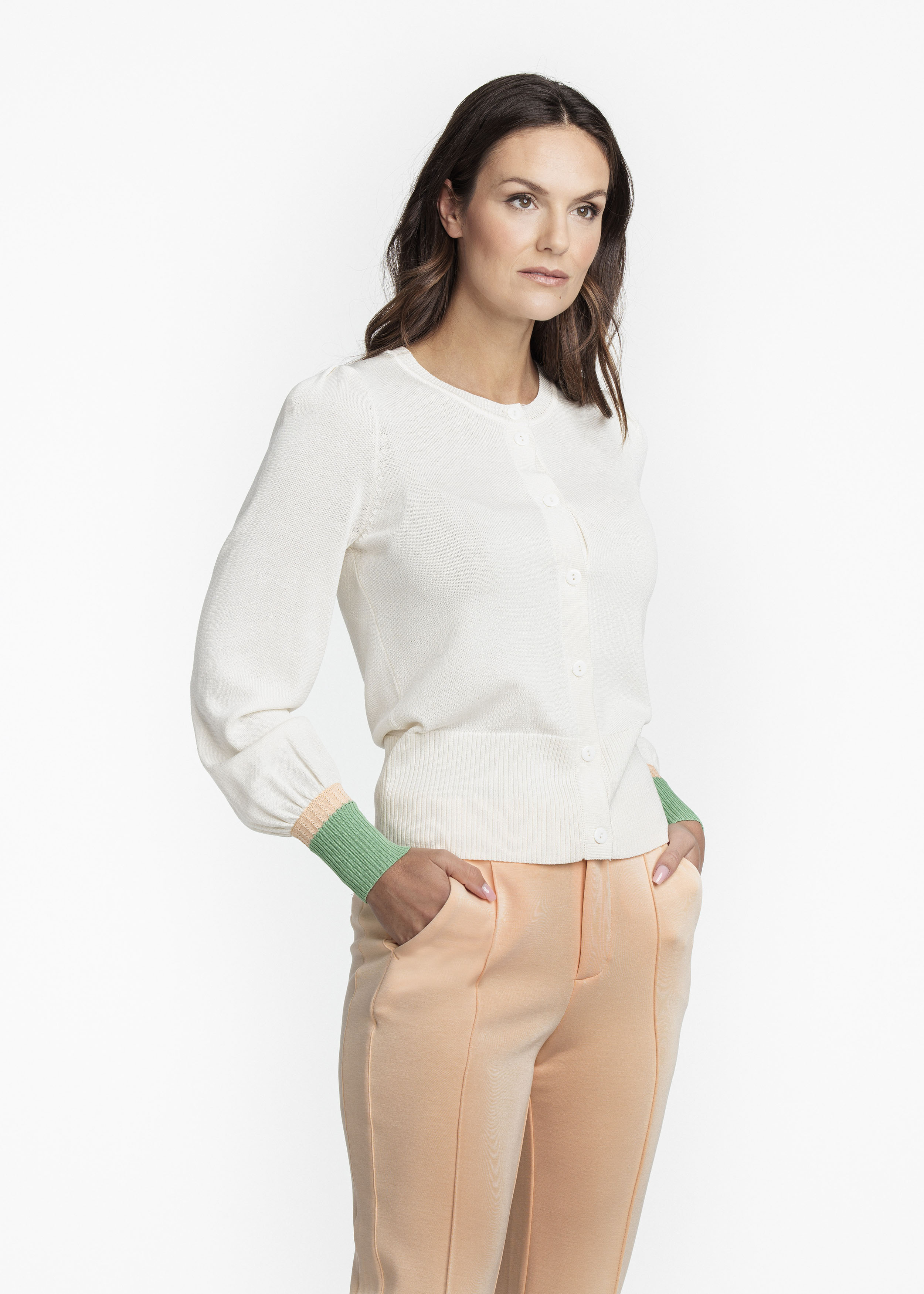 Fijn gebreid klassiek ronde hals vestje van 80% viscose met 20% nylon. De mouw is op de schouder met plooien aangezet en de ribgebreide manchet is tweekleurig.