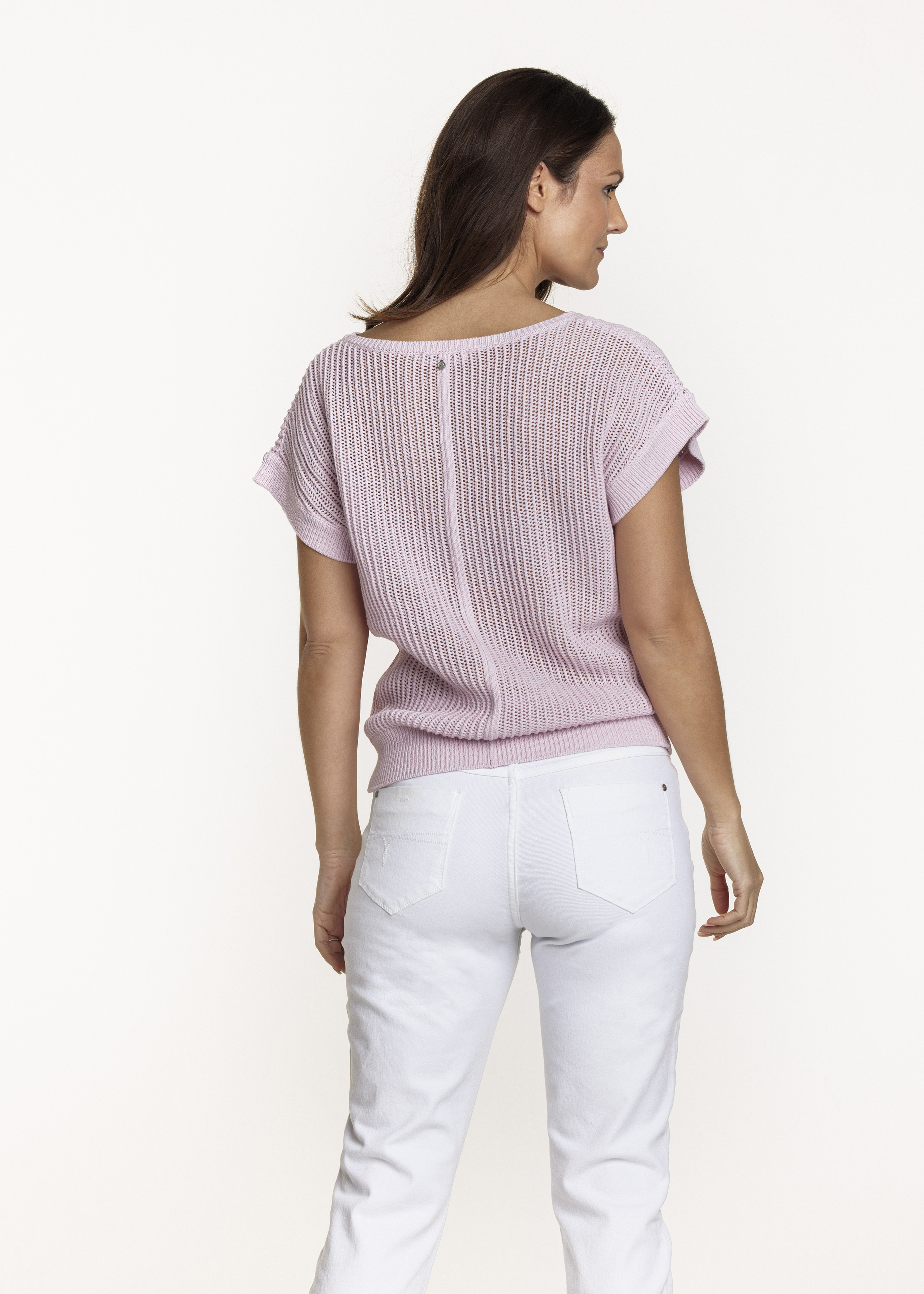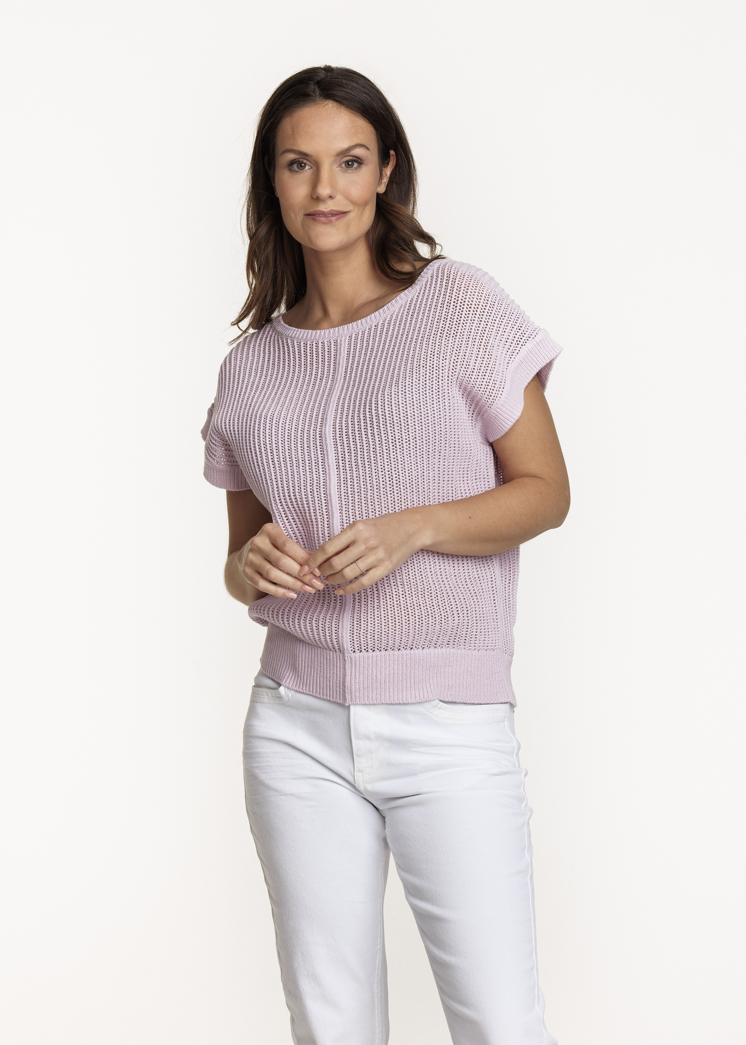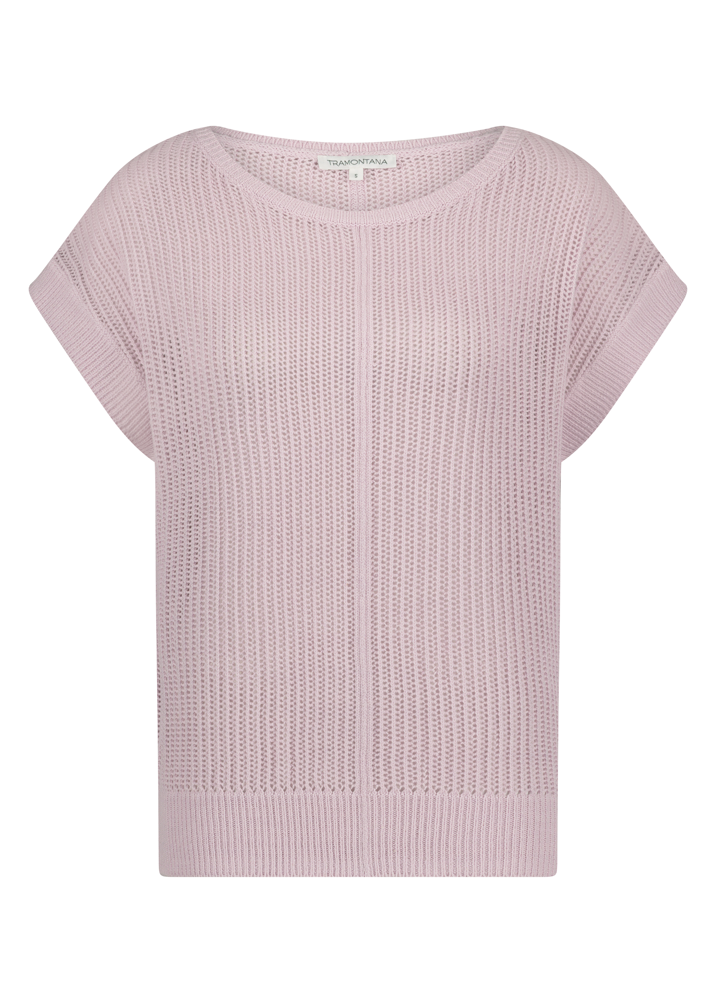 Mouwloze katoenmix jumper met een open fantasiesteek. Deze spencer staat fantastisch over een blouse of een top met lange mouw.