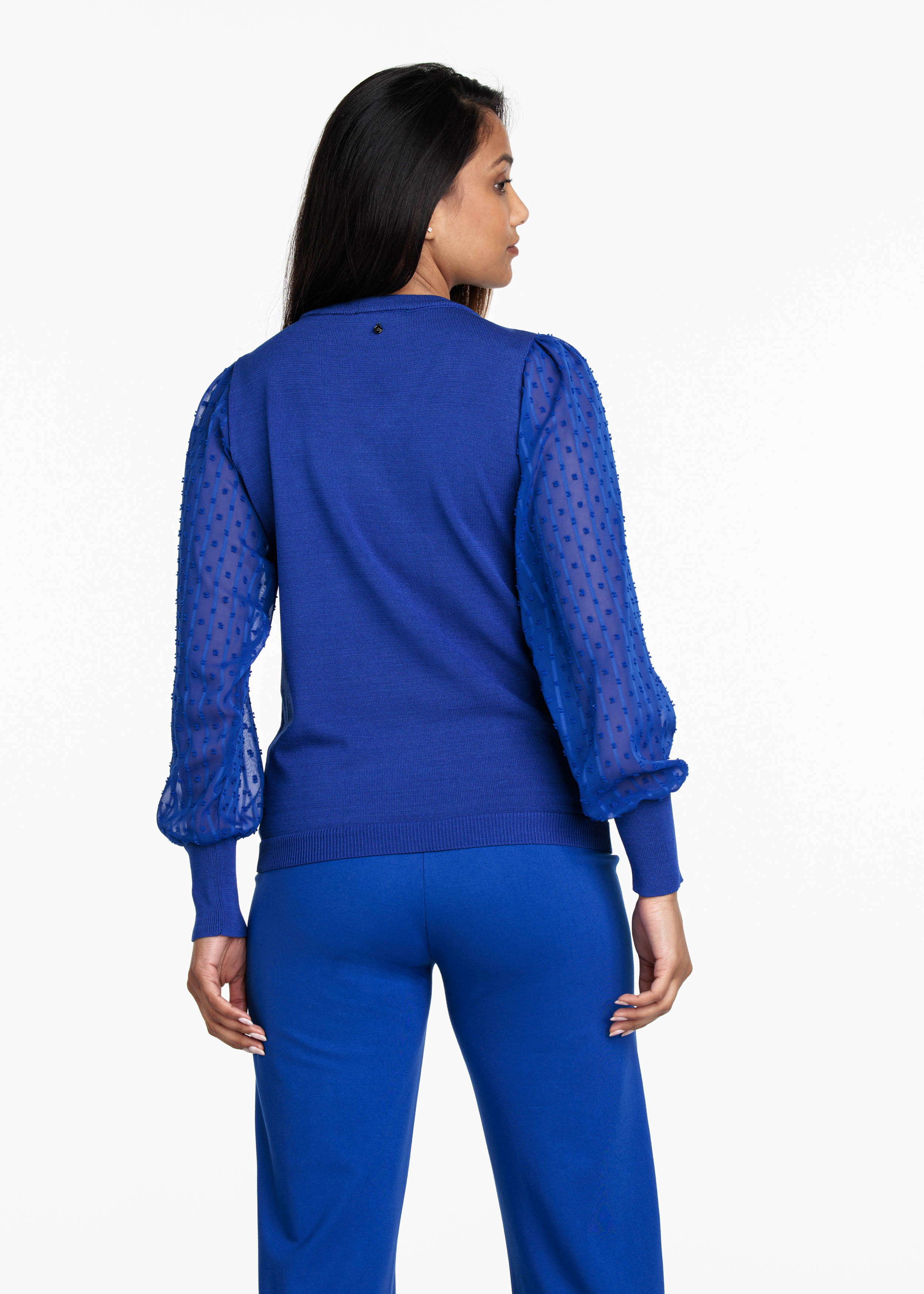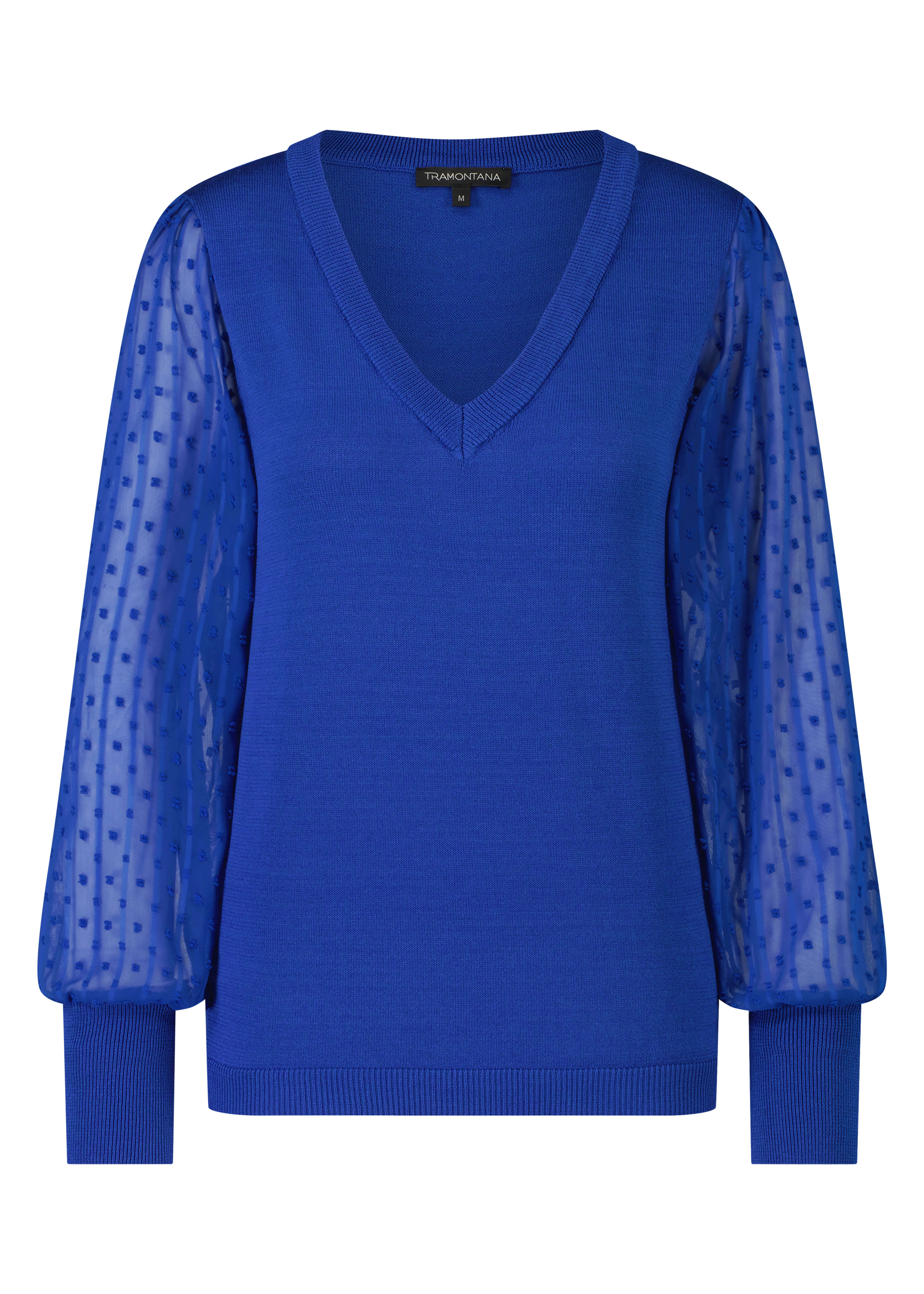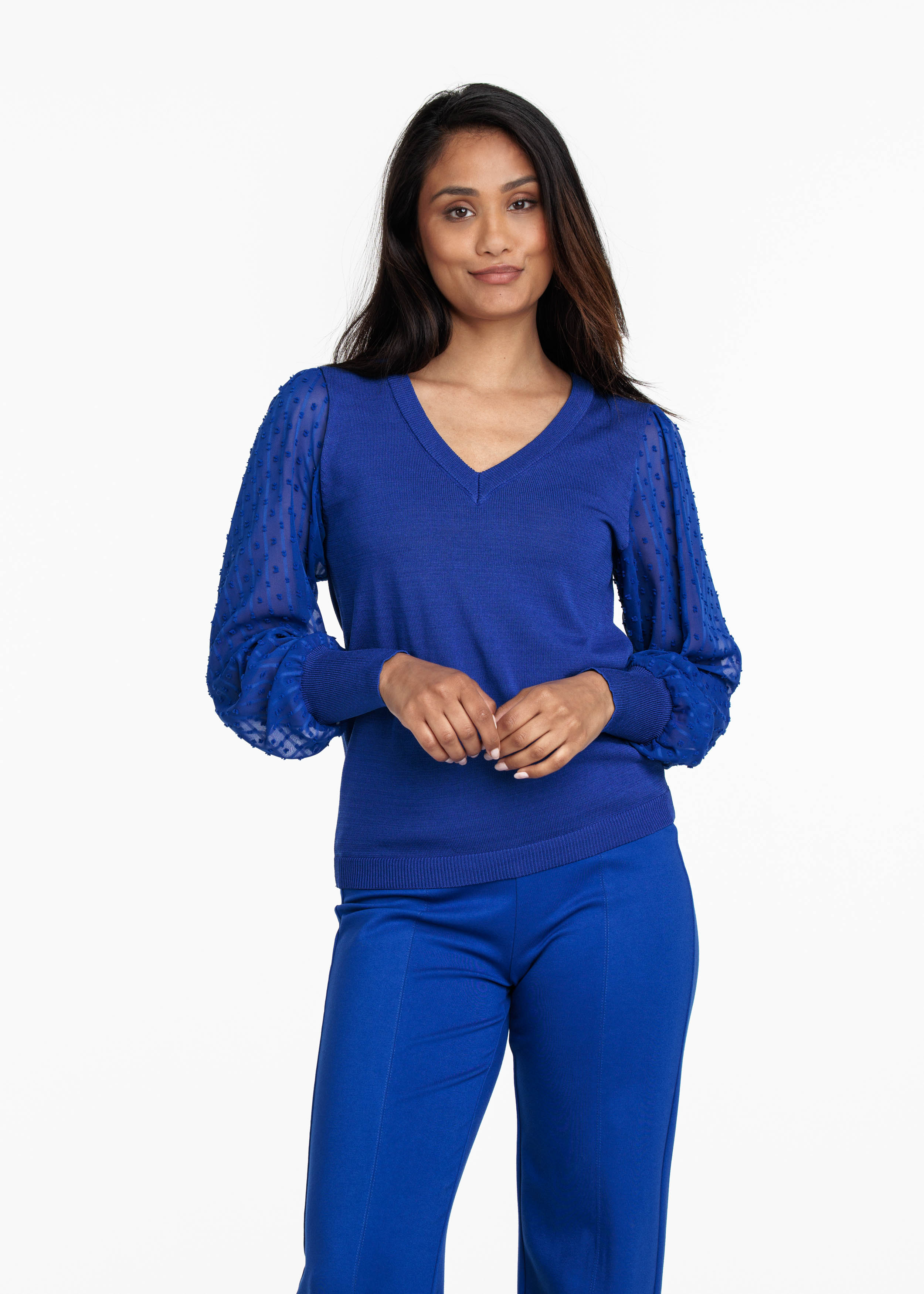 Gebreide V-hals jumper van 80% viscose met 20% nylon. De verfijnde transparante plumetis mouwen zijn decoratief en geven een tintje chique aan deze jumper.