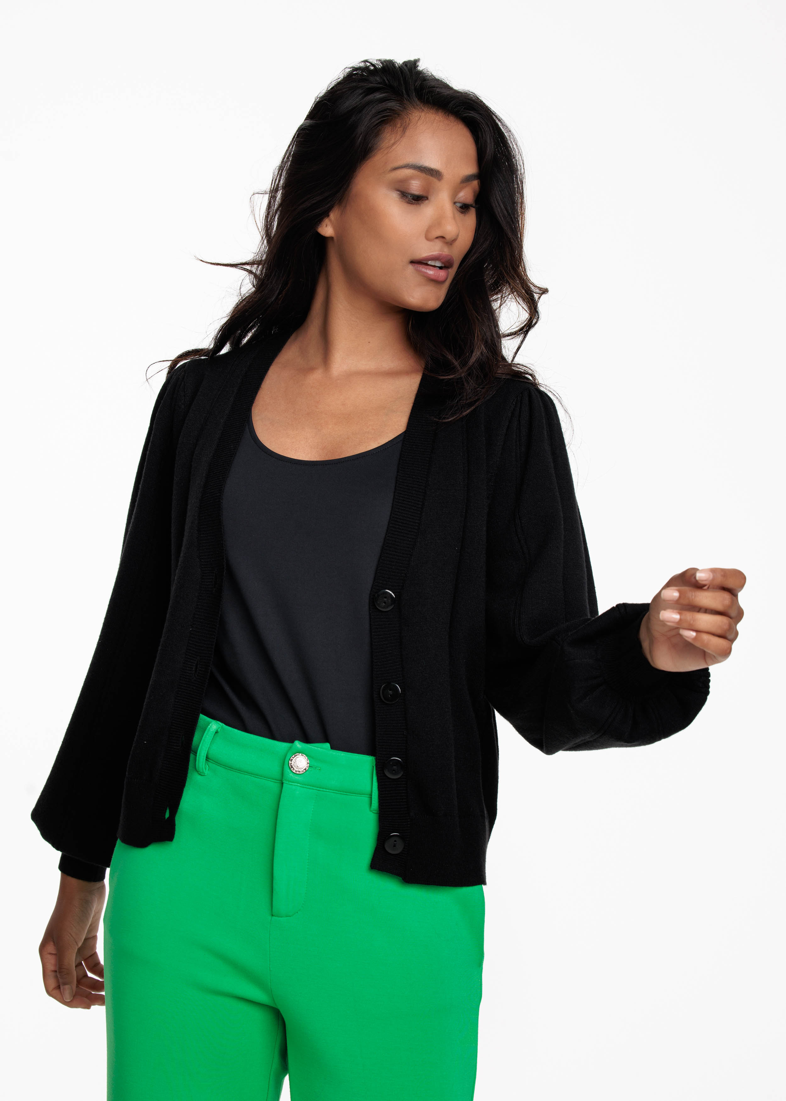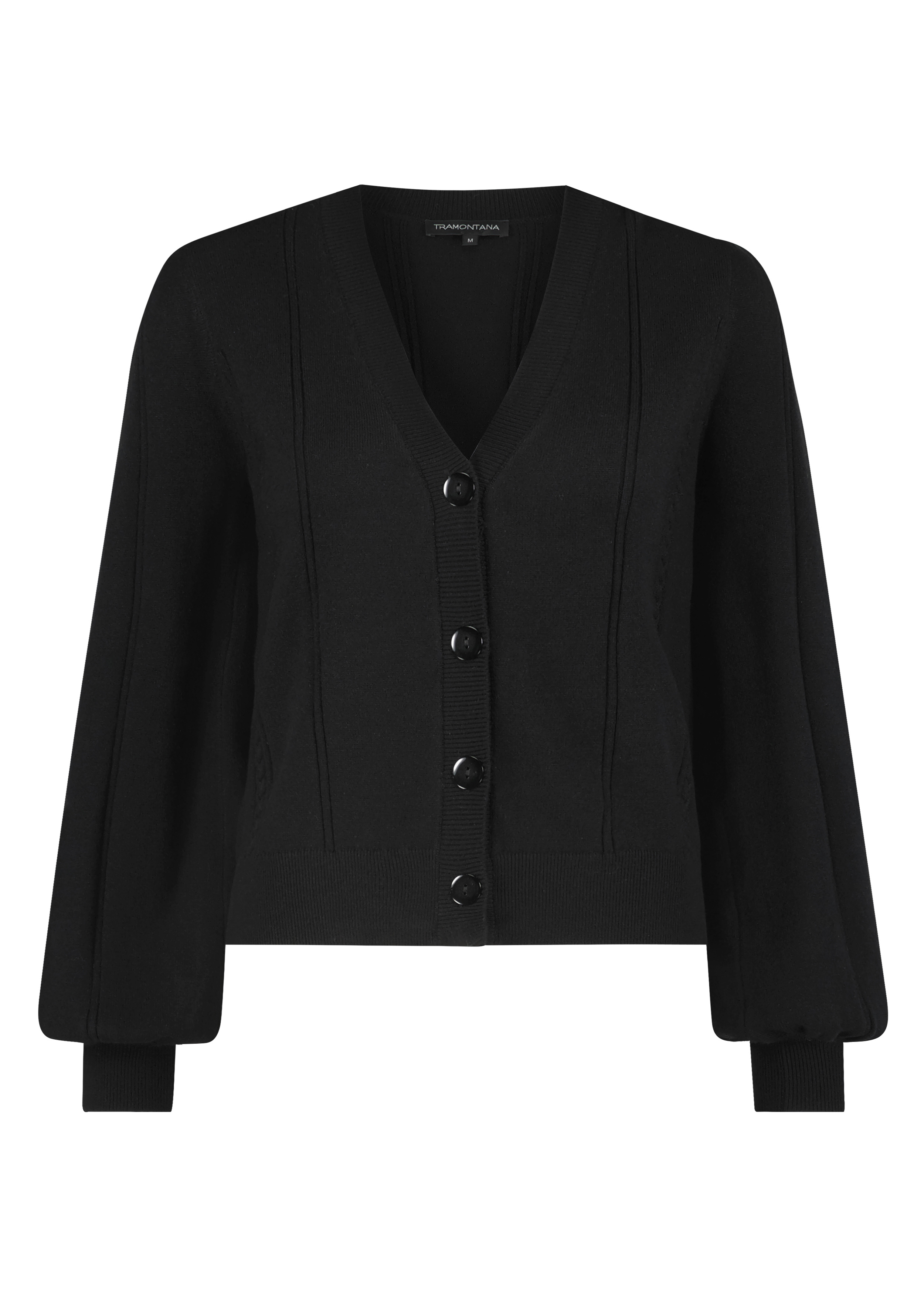 In banen met smalle kabel gebreid vest met geplooid aangezette royale mouwen. Dit korte vestje met normale pasvorm sluit met vier ton sur ton knopen. Het is gemaakt van 50% viscose, 30% polyamide en 20% polyester en heeft een rib gebreide boord en manchetten.