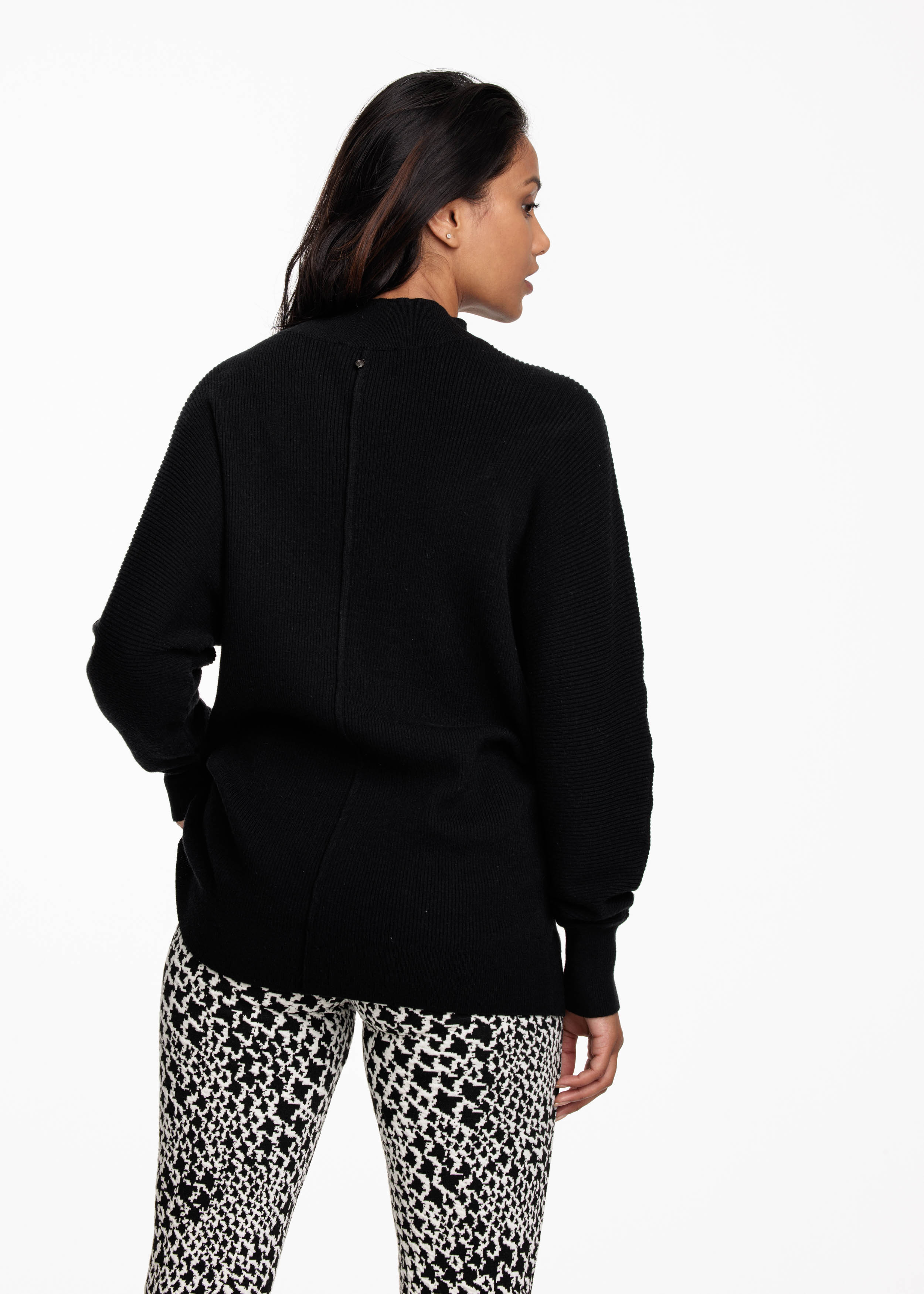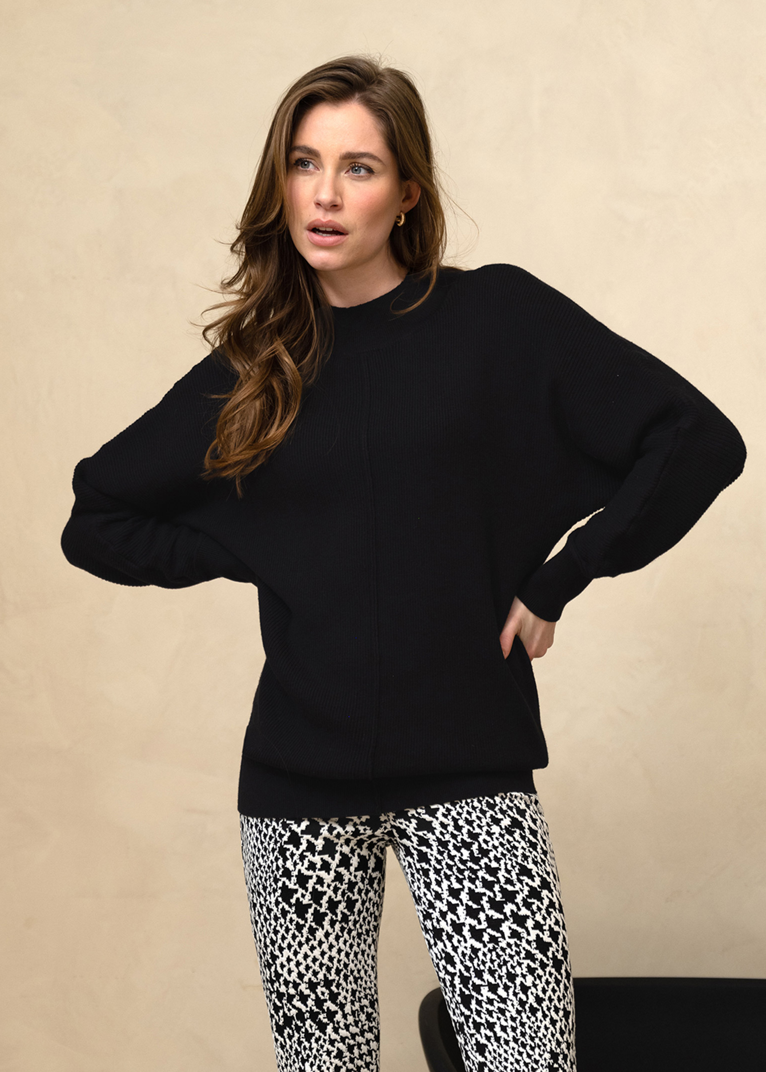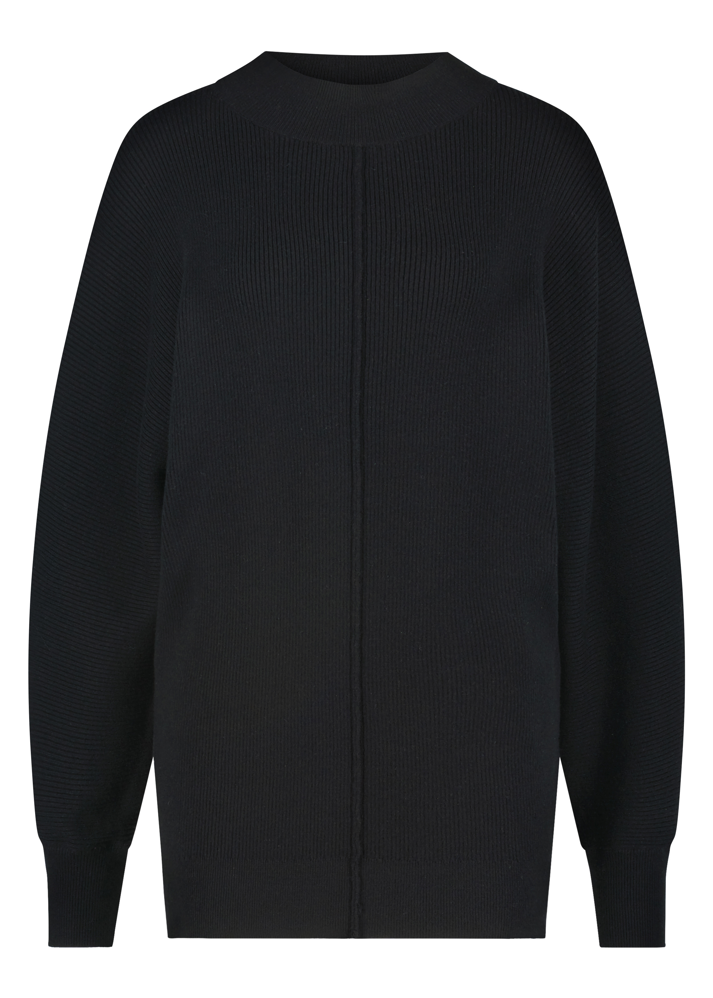 Ribgebreide oversized trui met ronde hals en vleermuismouwen in een zachte kwaliteit van viscose, polyamide en polyester. De lengte valt ruim over de heupen. Over de voor en achterkant loopt een loc naad om het vlak te doorbreken.