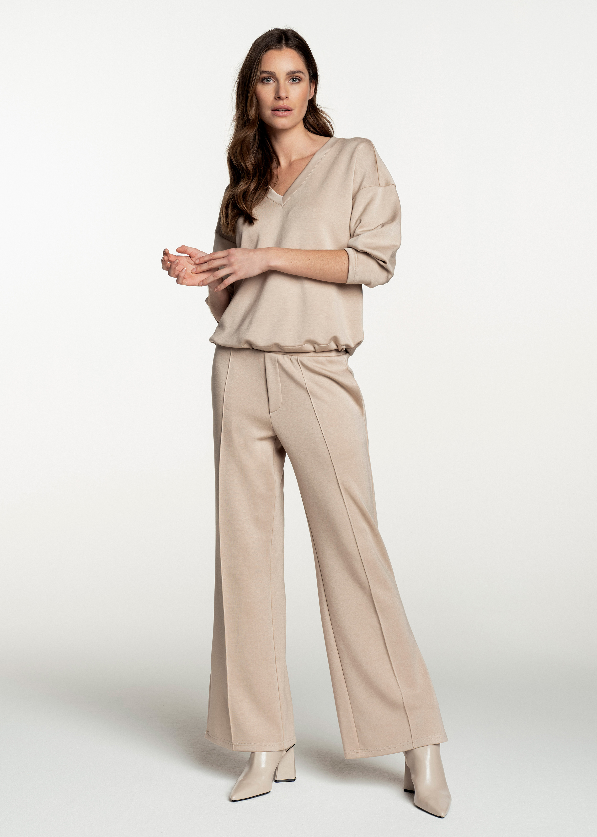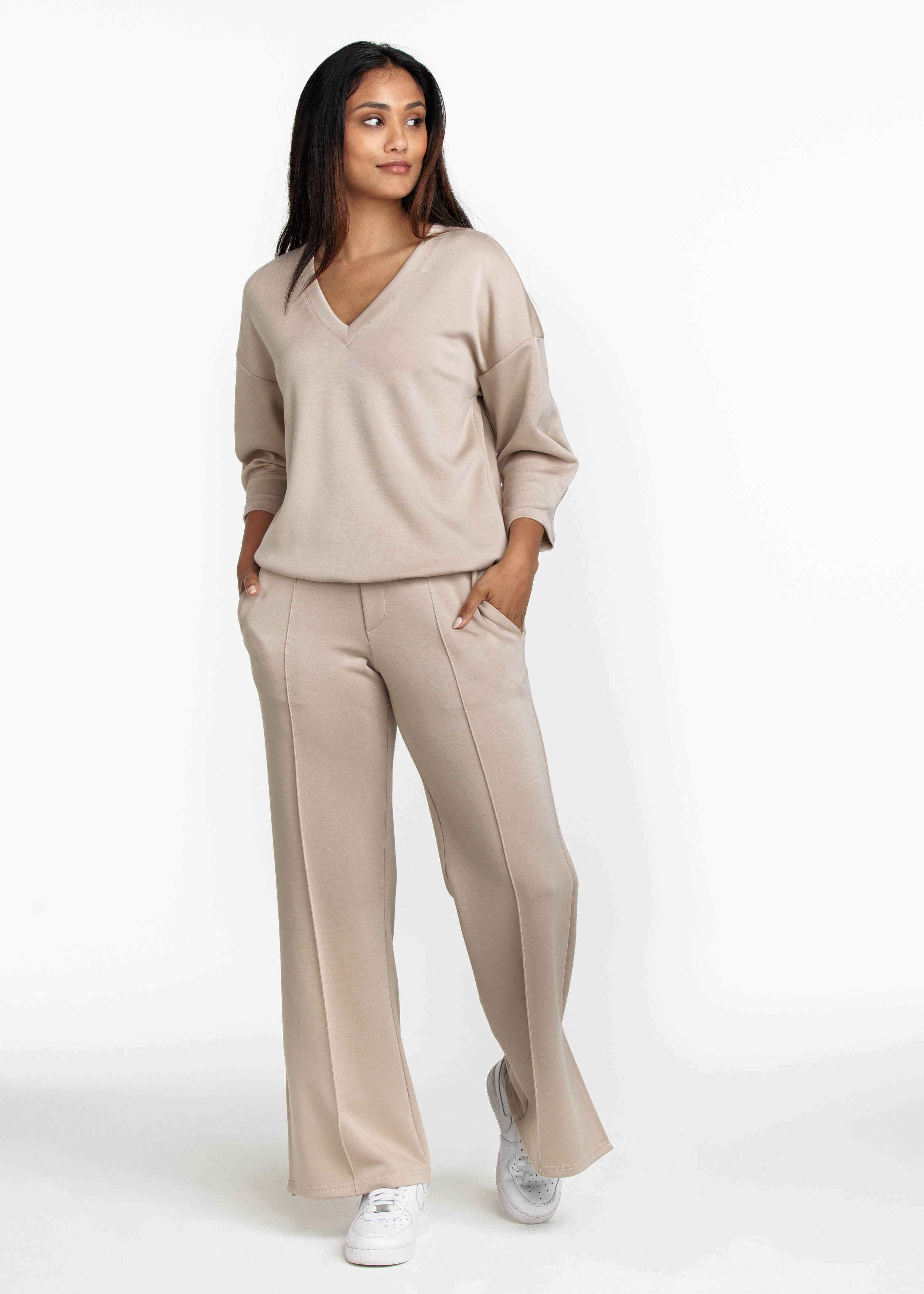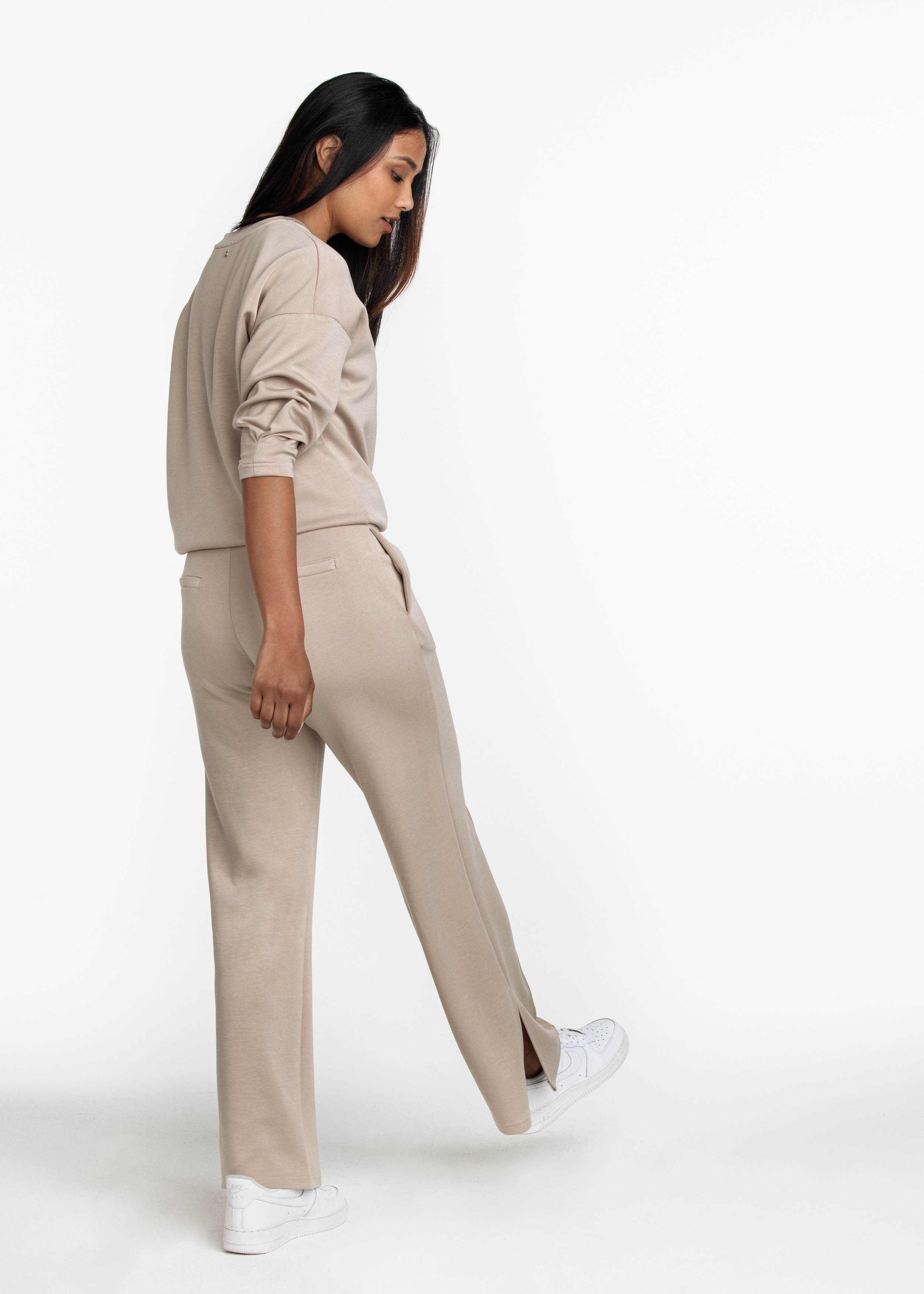 Relaxte, wijde pantalon met zijsplitten aan de onderkant van viscose/polyester/elastaan. De tailleband is een comfortabel zittend elastiek. Aan de voorkant zit een pintuck naad voor een vleugje chique met aan de achterkant twee valse paspelzakjes. Met de bijpassende V-hals sweater maakt deze combinatie een sportief elegante set.