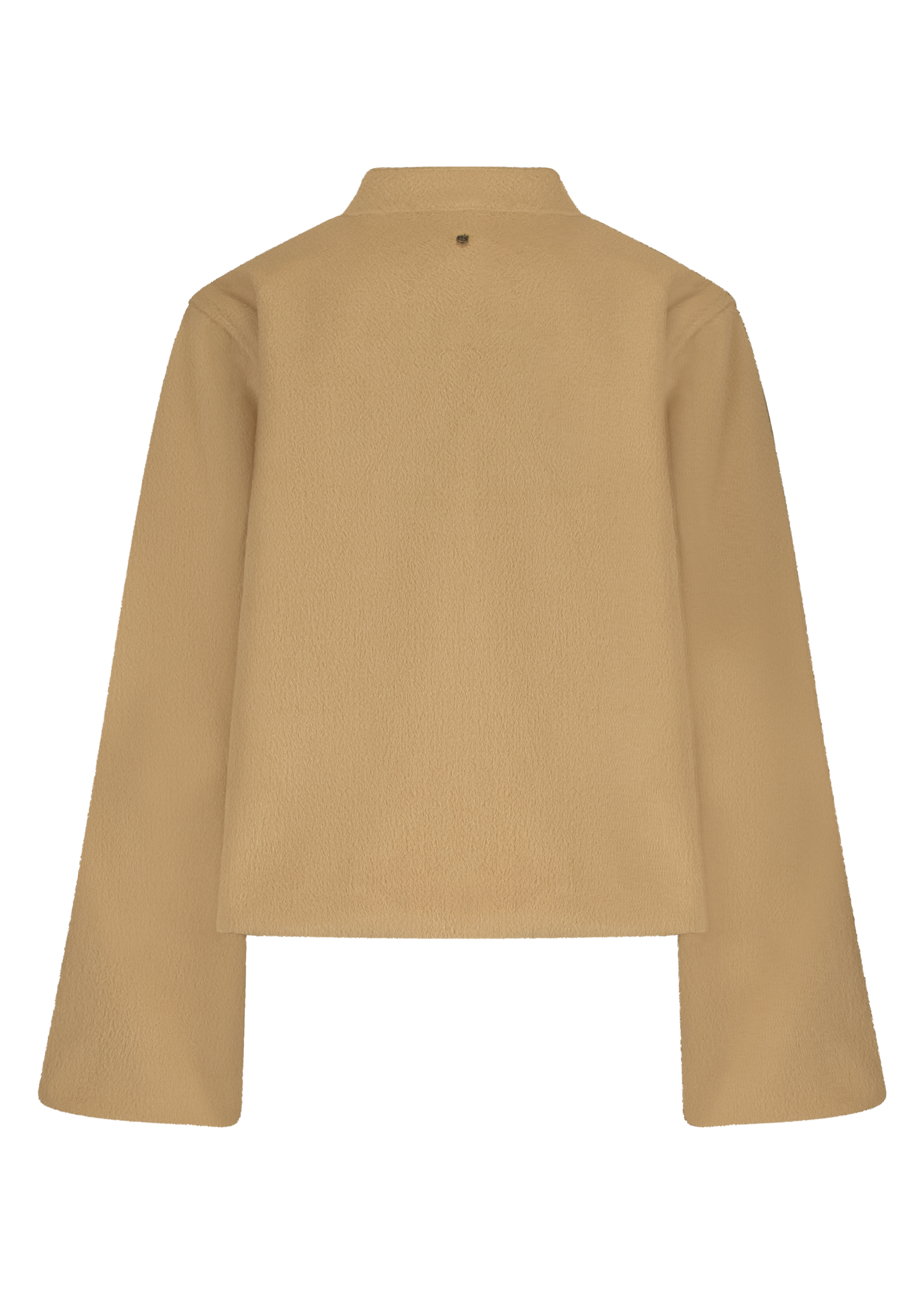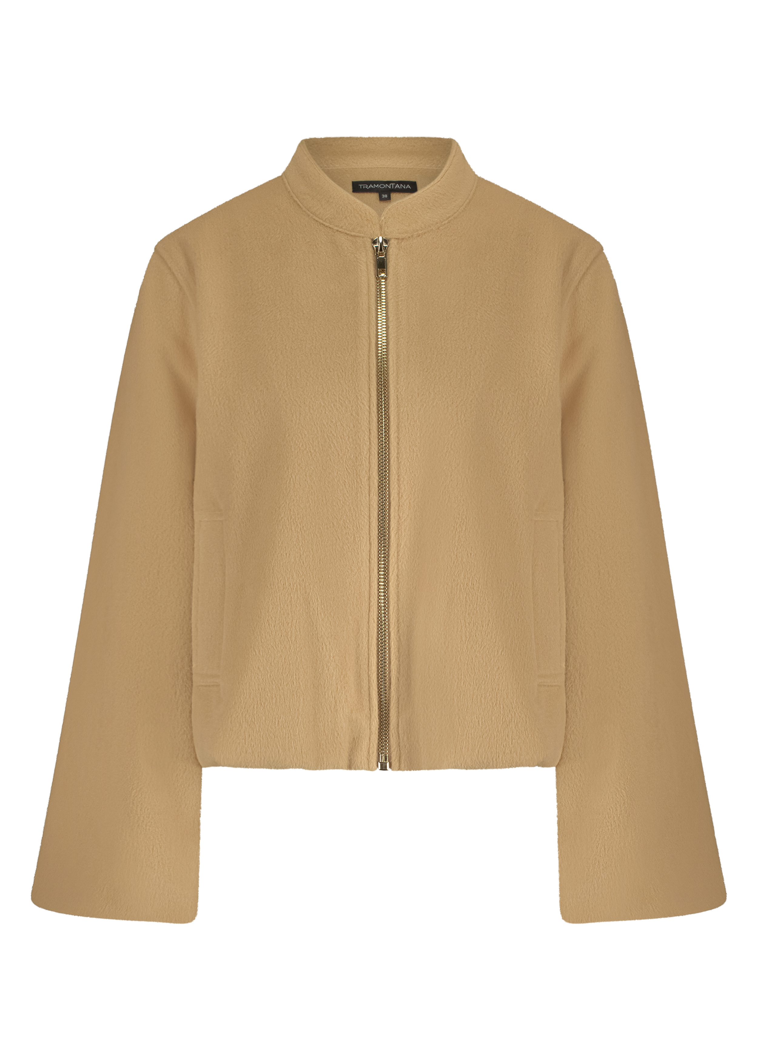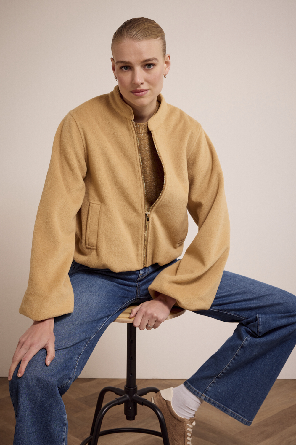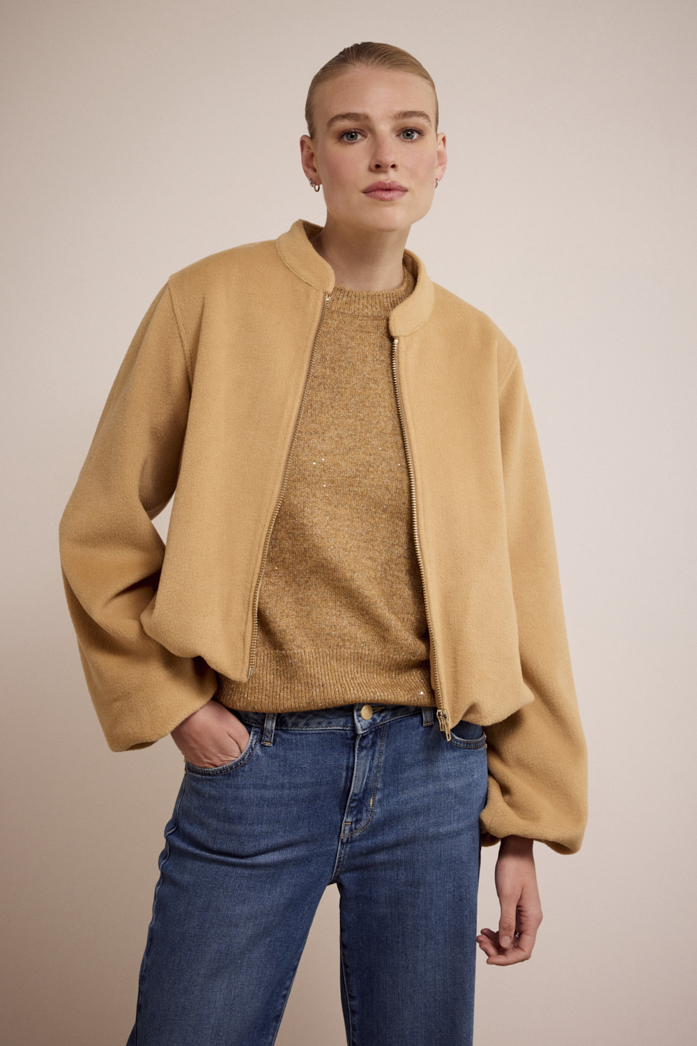De ballonvormige snit geeft het jasje een speels en eigentijds karakter, terwijl de klassieke bomberdetails zorgen voor een sportieve basis. Verkrijgbaar in Camel Melange en Black, past dit item perfect bij het warme kleurenpalet van het seizoen.