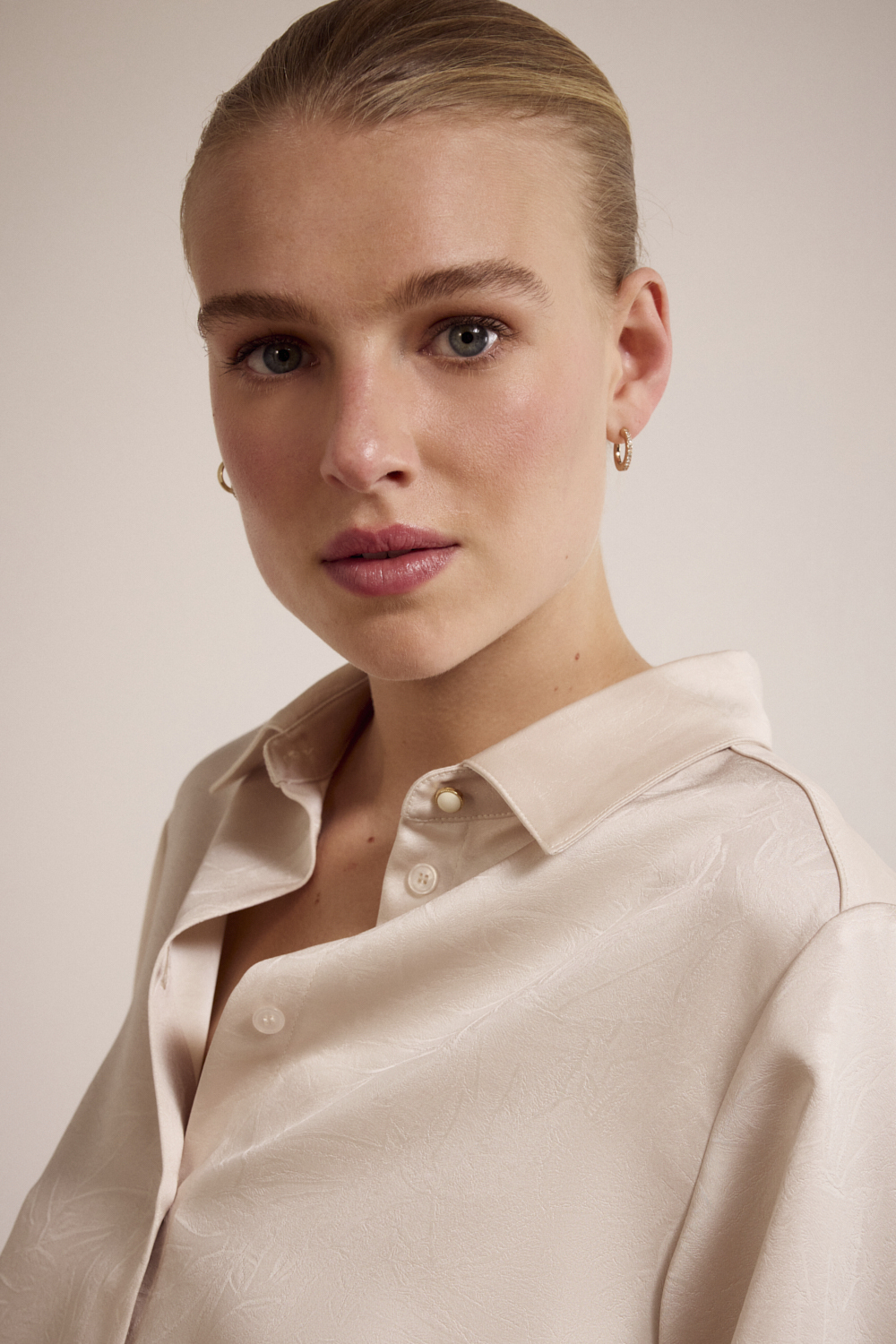 De leerachtige afwerking geeft de blouse een moderne, edgy look, terwijl de soepele stof zorgt voor een elegante uitstraling. Het eenvoudige, strakke ontwerp maakt de blouse veelzijdig genoeg om met diverse kledingstukken te combineren. Draag de Blouse Leather Look met een nette broek voor een chique uitstraling of met jeans voor een meer casual look.