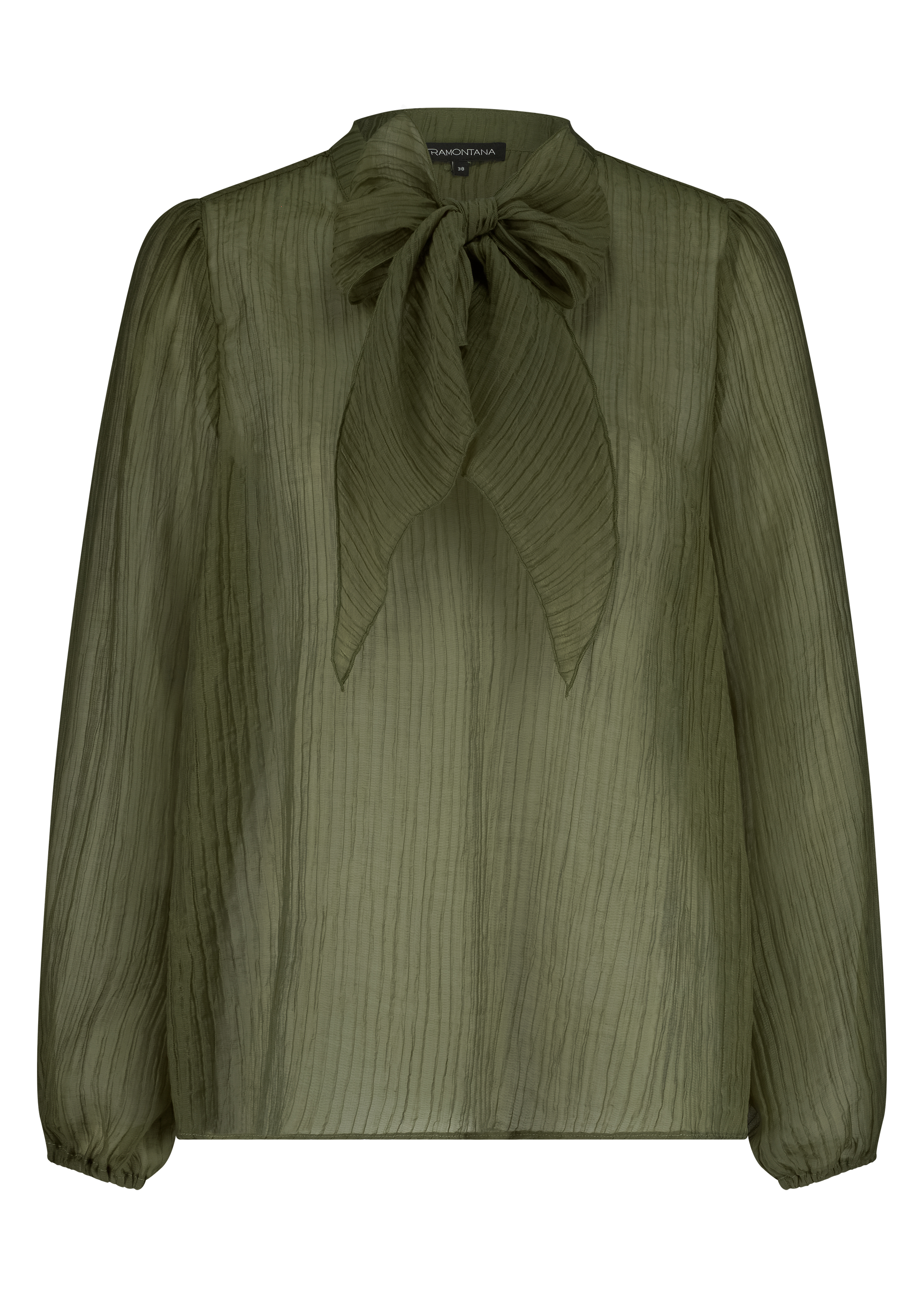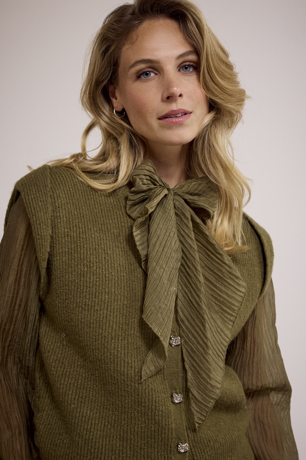 De strikdetail op de schouder voegt een vrouwelijke touch toe zonder te overheersen, en geeft net dat beetje extra aan het eenvoudige silhouet. De diepe mosgroene kleur (006501 – Moss) sluit prachtig aan bij het warme herfstpalet en is makkelijk te combineren met zowel lichte als donkere tinten.