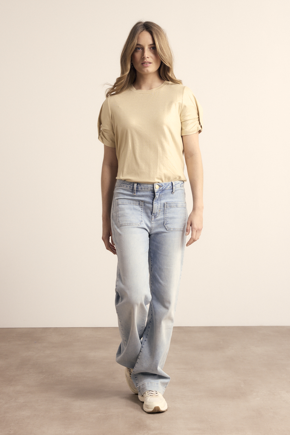 De Coated T-Shirt is een moderne en stijlvolle top met een eigentijdse, luxe uitstraling. Dit shirt is gemaakt van een comfortabele en soepele stofmix van 95% viscose en 5% elastaan, wat zorgt voor een zacht draaggevoel, prettige stretch en een mooie pasvorm die soepel om het lichaam valt. De subtiele coating geeft het oppervlak een lichte glans en creëert een verfijnd, bijna satijnachtig effect dat deze top net dat beetje extra geeft. De ronde hals zorgt voor een tijdloze en veelzijdige basis, terwijl de korte mouwen met omslagdetail een nonchalant en modieus accent toevoegen. Verkrijgbaar in de kleuren Pebble en Ink, laat dit T-shirt zich eenvoudig aanpassen aan verschillende stijlen en gelegenheden. Combineer de Coated T-Shirt met een jeans of casual broek voor een trendy everyday look, of draag hem met een elegante pantalon of rok voor een meer geklede outfit. Een veelzijdig en stijlvol item dat moeiteloos comfort en moderne elegantie toevoegt aan elke garderobe.