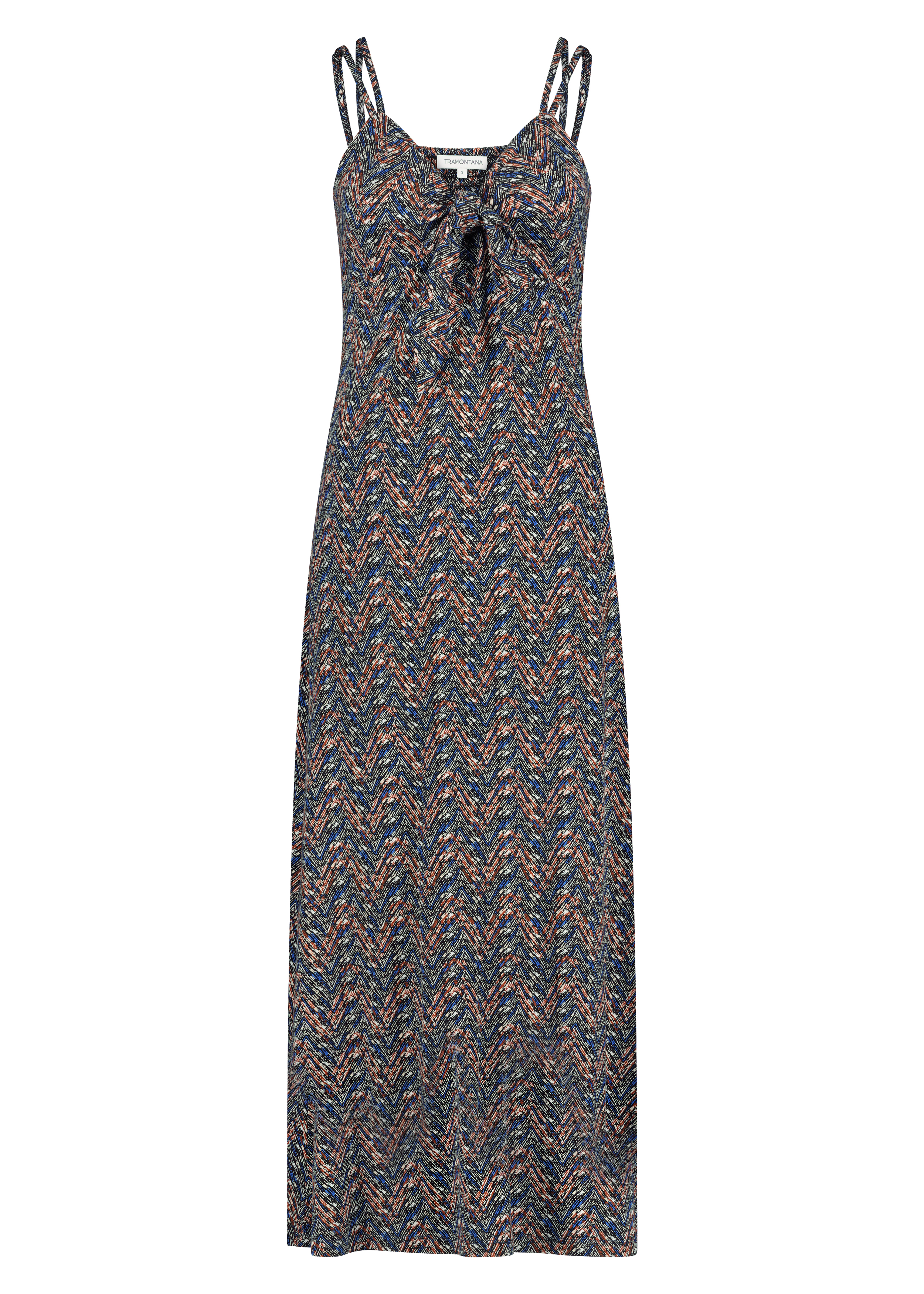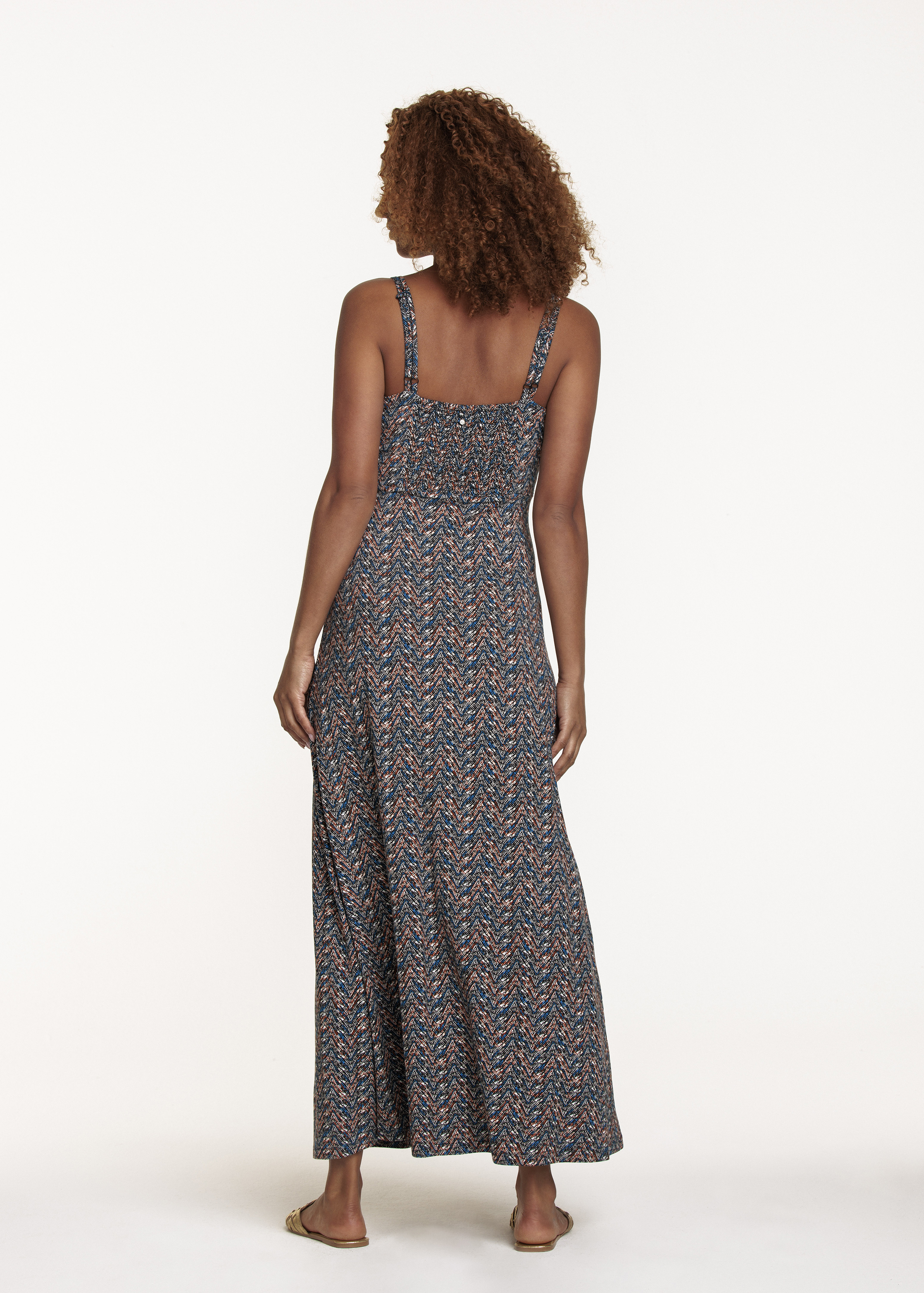 Lange zomerse viscose-elastaan A-lijn jurk met verstelbare spaghetti bandjes. Aan de voorkant is de stof bij elkaar geknoopt en op de rug zit een smok accent om de jurk nog extra detail te geven.