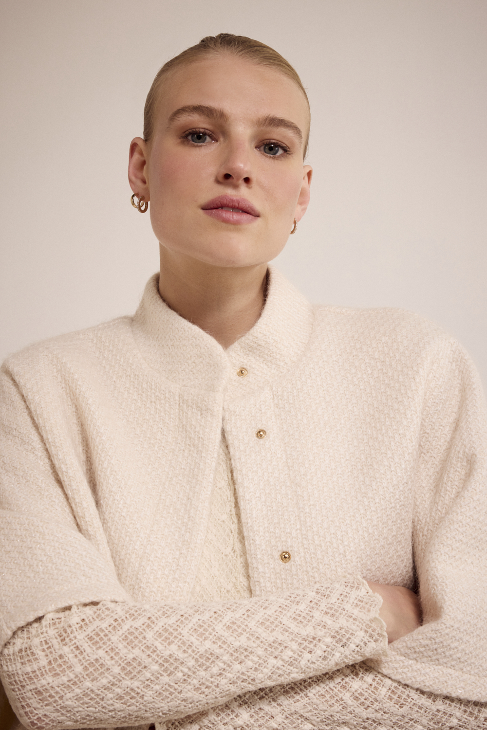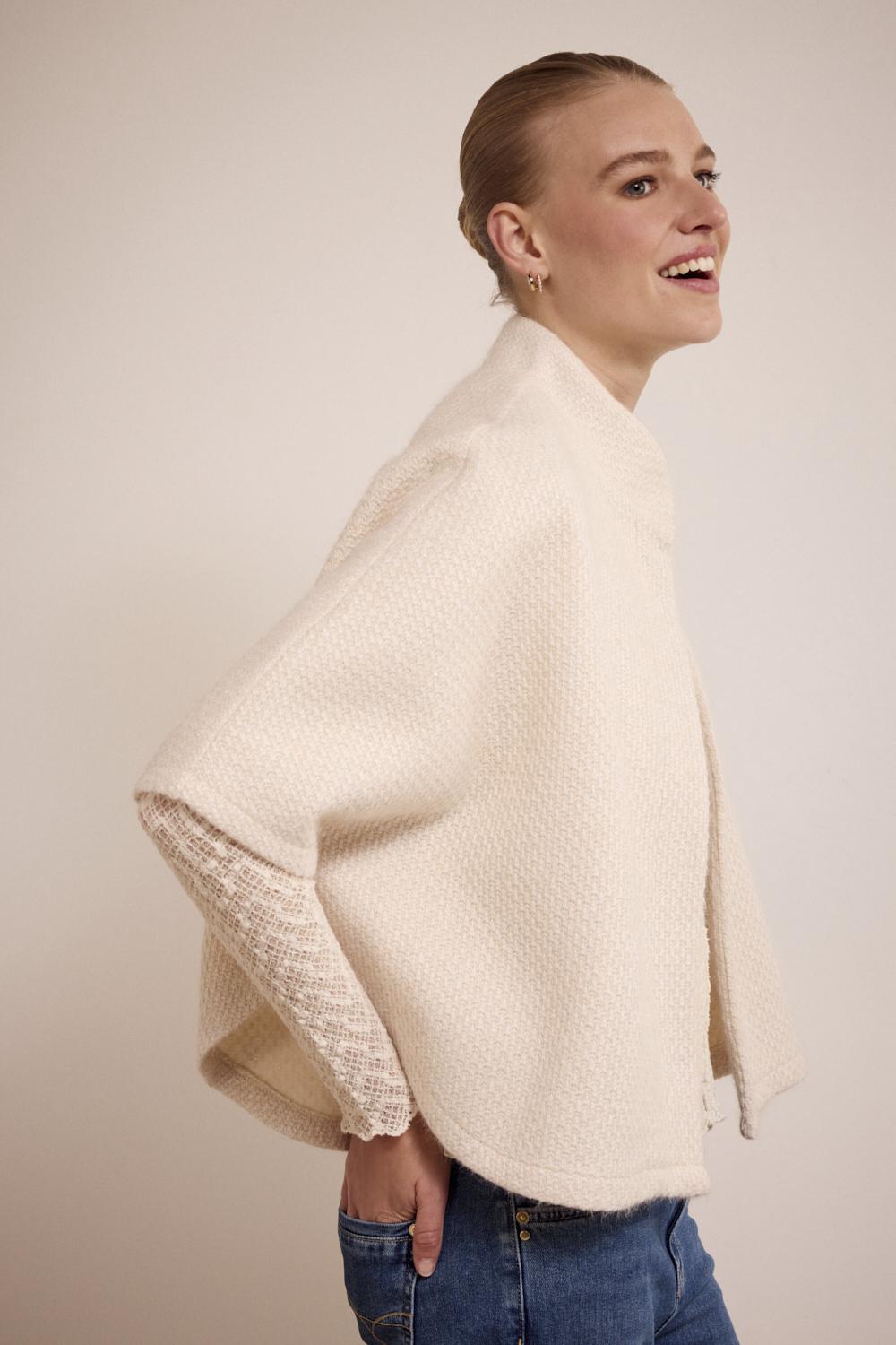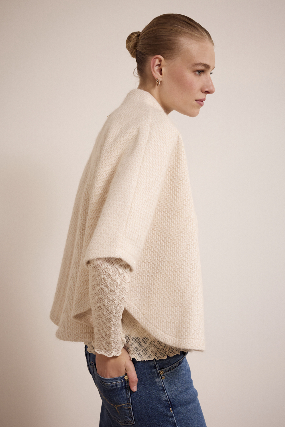 De kleur Stone Melange (006801) geeft het item een zachte, tijdloze basis die gemakkelijk te combineren is met zowel neutrale als diepe herfsttinten. De wijde snit en openvallend model maken het ideaal om nonchalant over een blouse, trui of jurk te dragen – perfect voor het creëren van gelaagde looks.