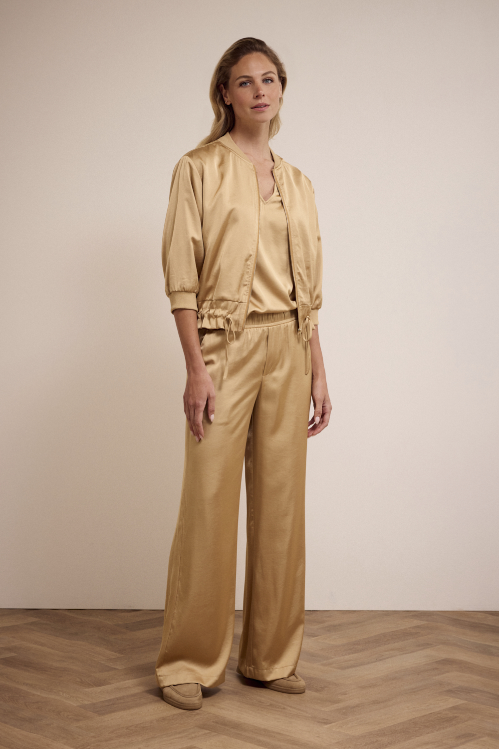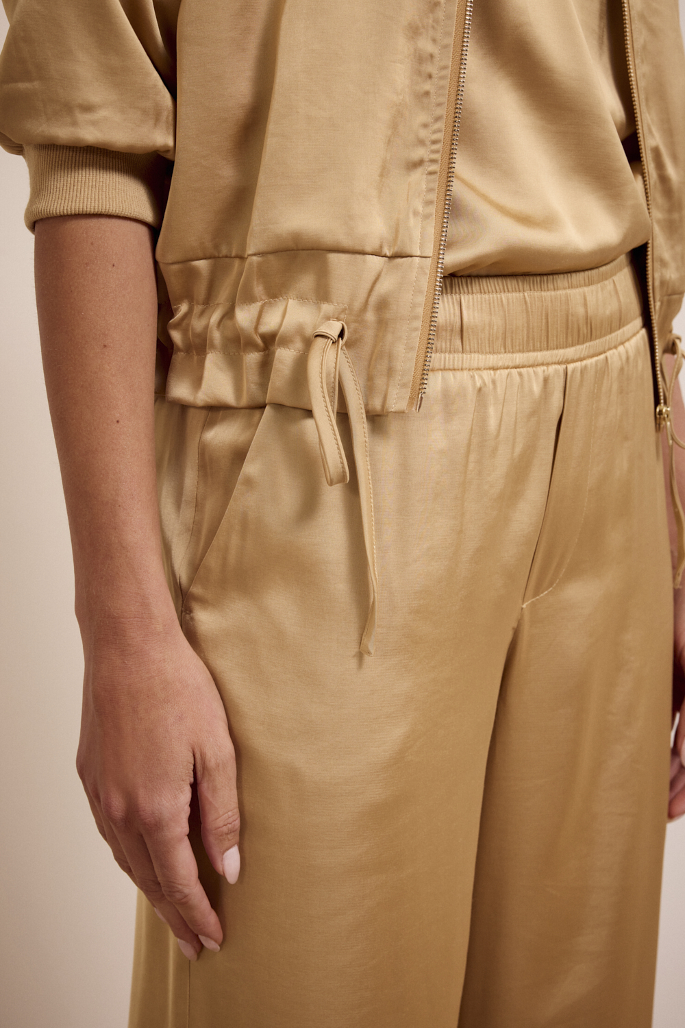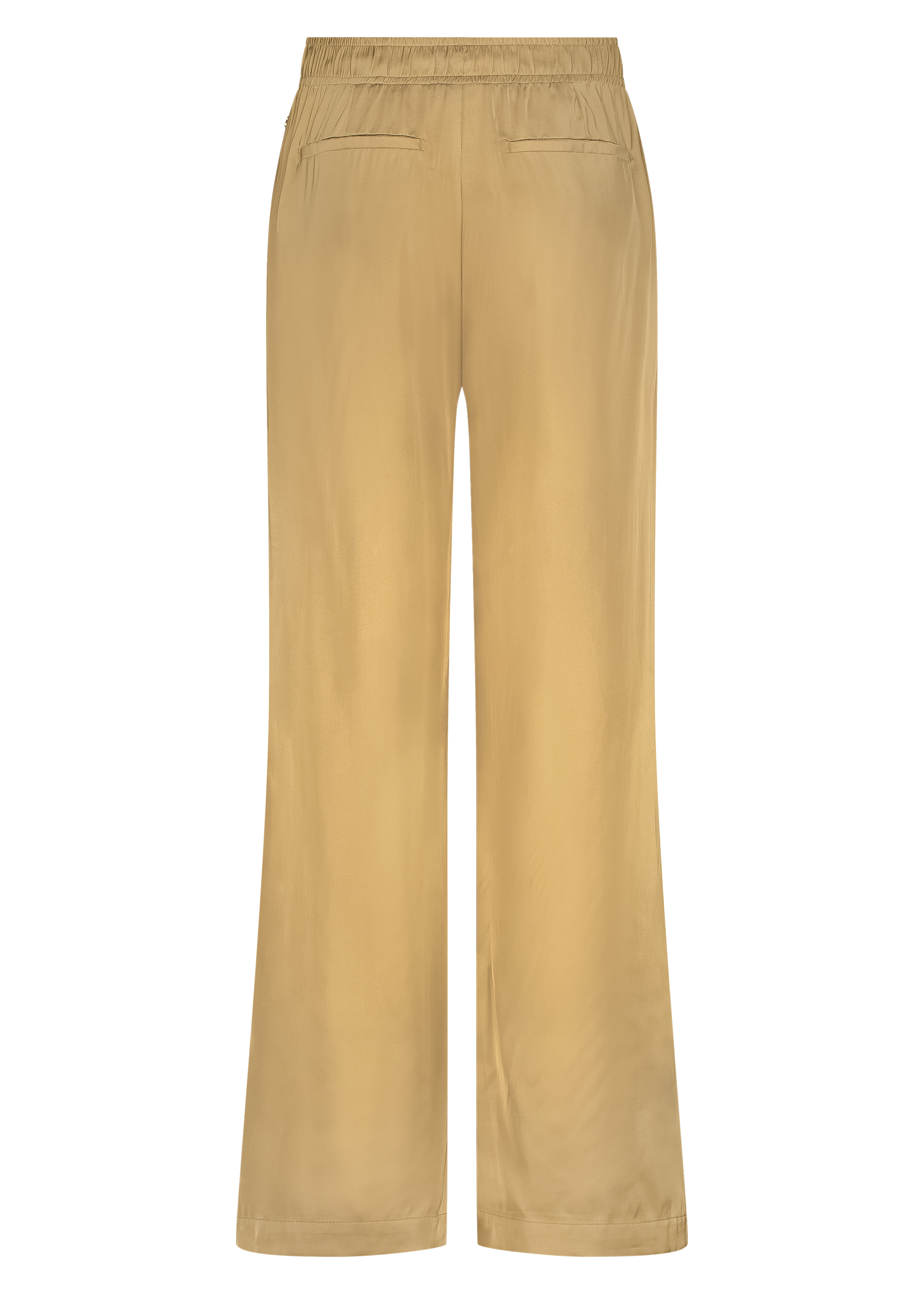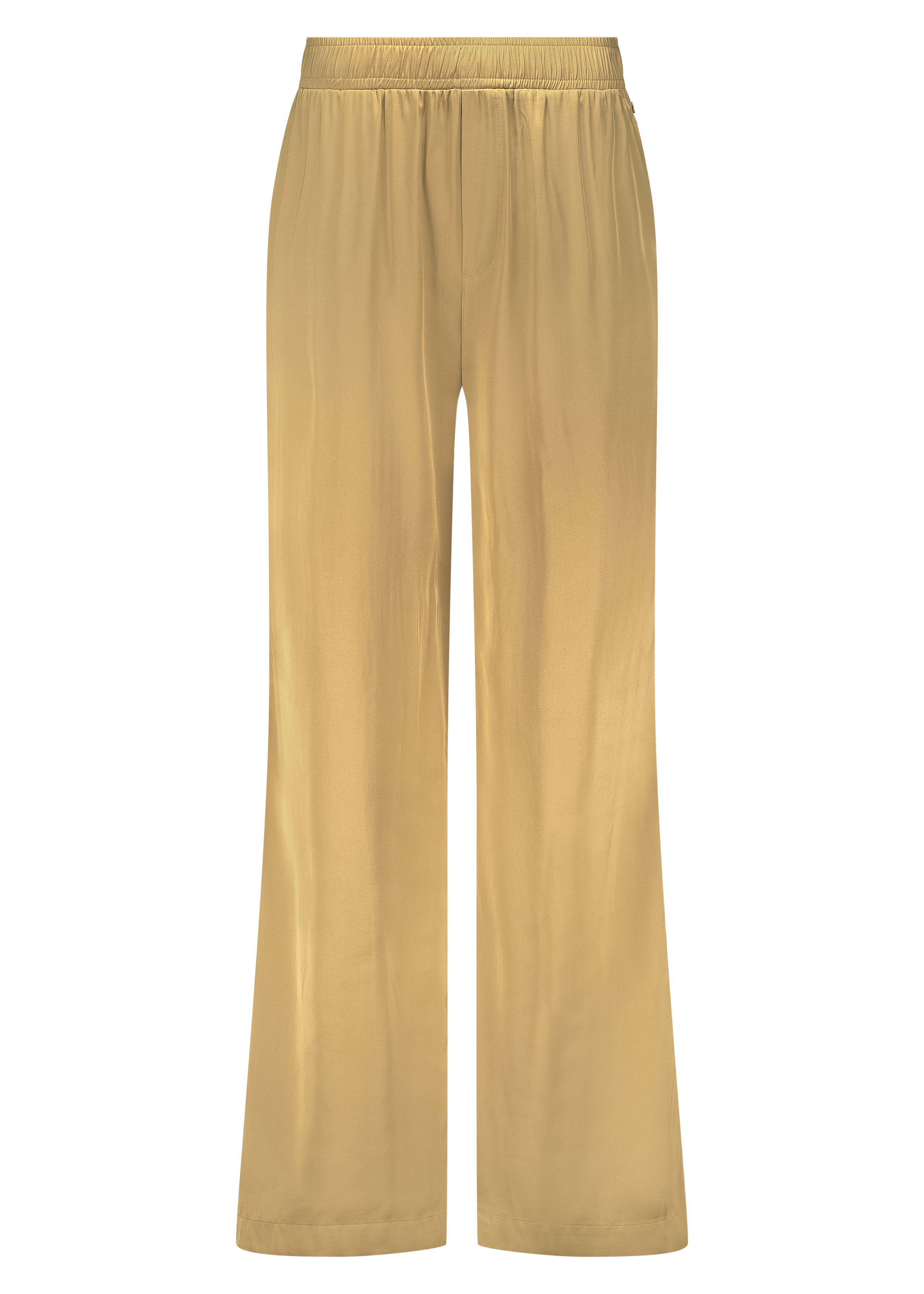 De warme camelkleur (002800 – Camel) sluit perfect aan bij het herfstpalet en maakt deze broek geschikt voor zowel overdag als 's avonds. De licht glinsterende, gehamerde satinstof geeft de broek een luxe uitstraling zonder te overdrijven, terwijl de rechte of iets wijde pijpen zorgen voor een moderne, flatterende fit.