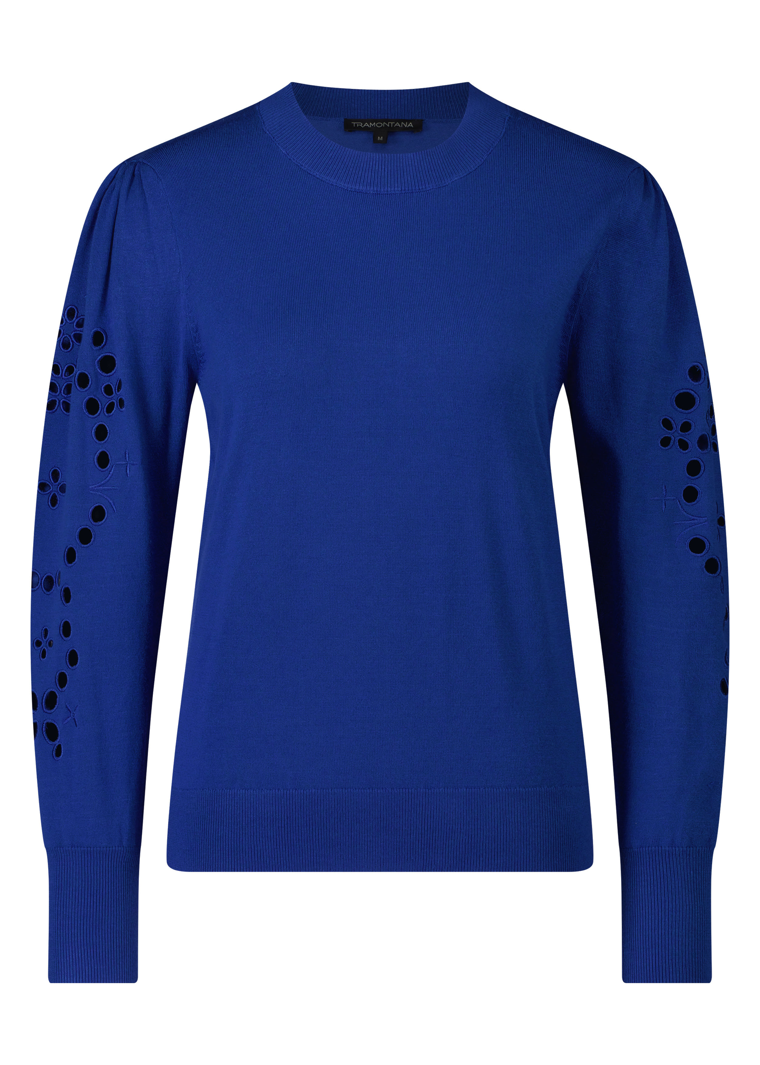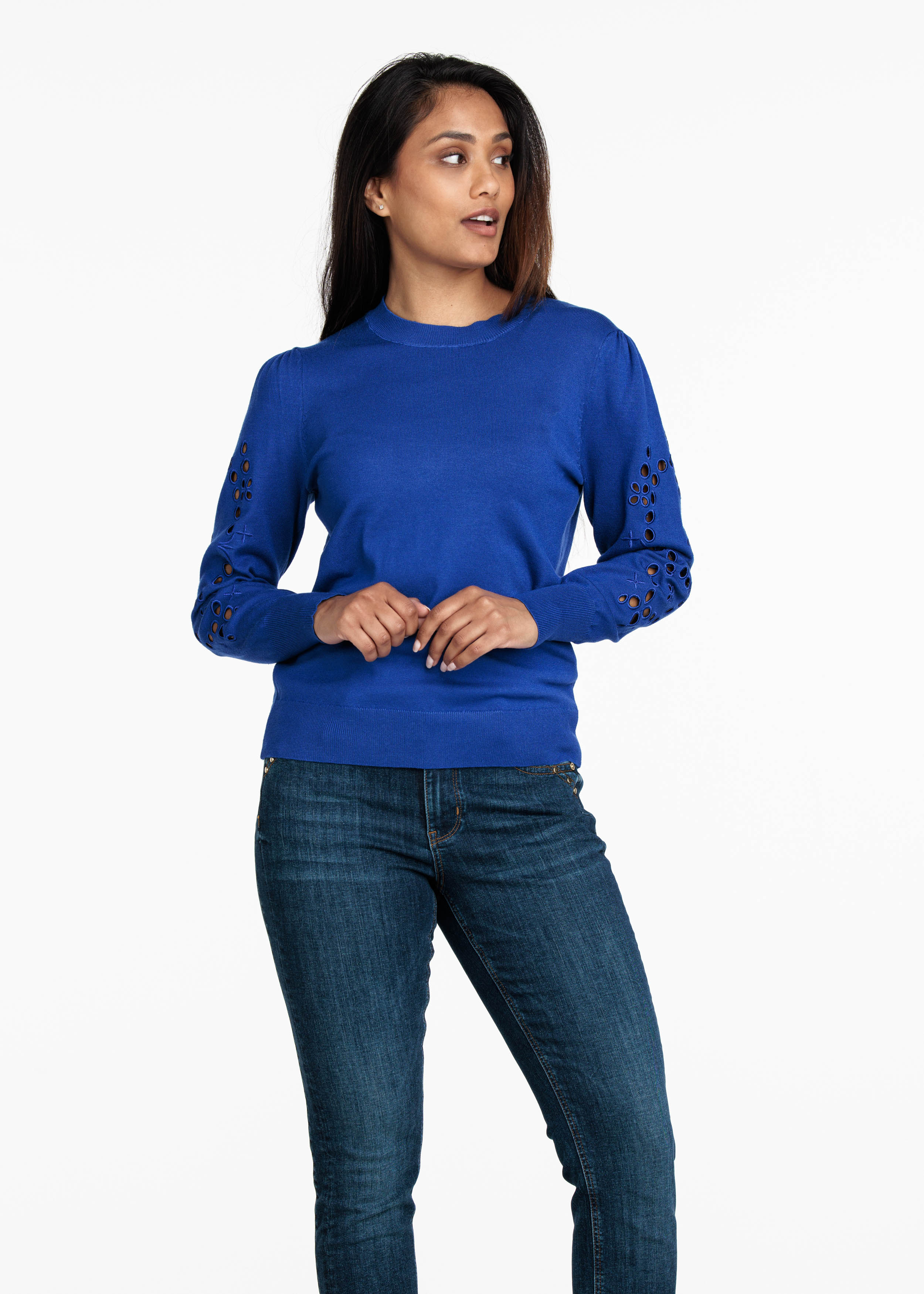 Ronde hals jumper van 85% viscose en 15% polyamide met opengewerkt fantasie borduursel op de mouwen. Deze trui heeft een normale pasvorm.