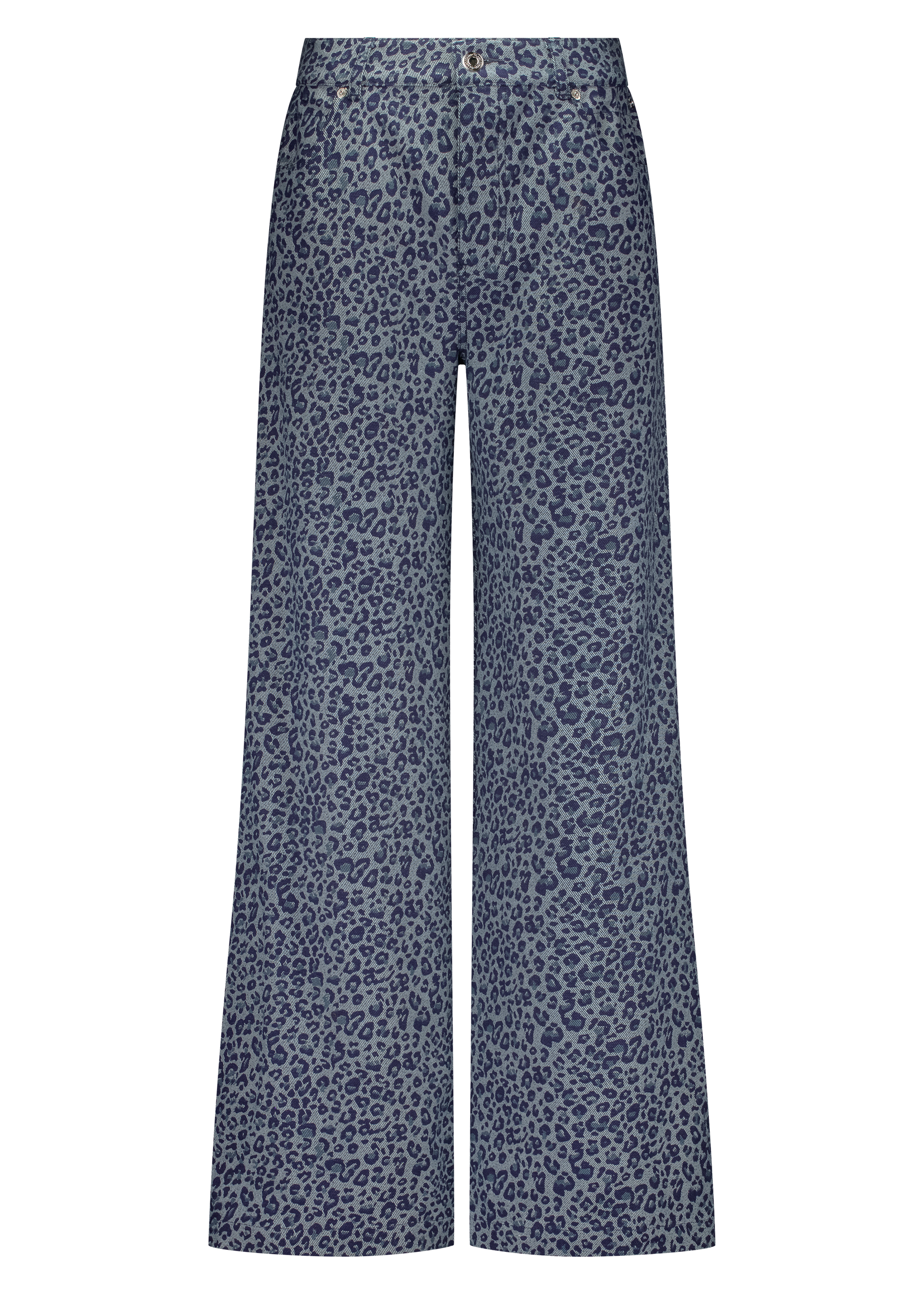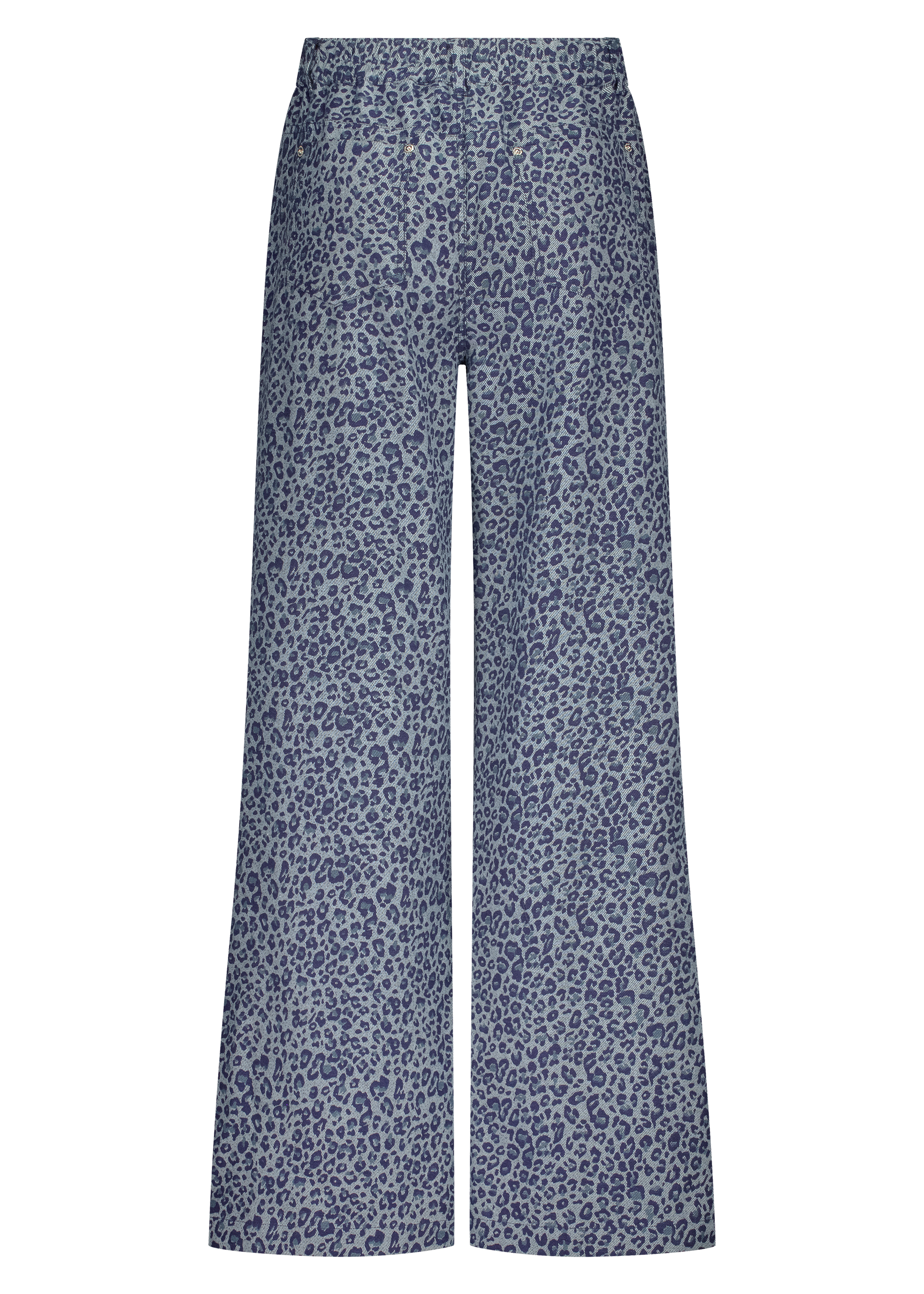 De denim in Blue met een ton-sur-ton leopardprint zorgt voor een verrassend effect: opvallend, maar toch makkelijk te combineren. De rechte pasvorm geeft een moderne, flatterende look die perfect werkt met zowel chunky knits als strakke tops.