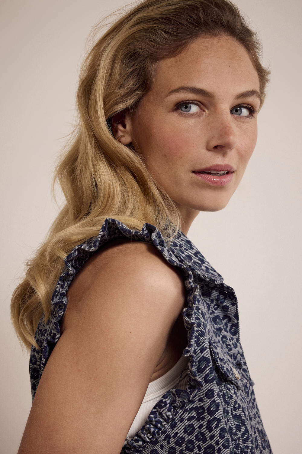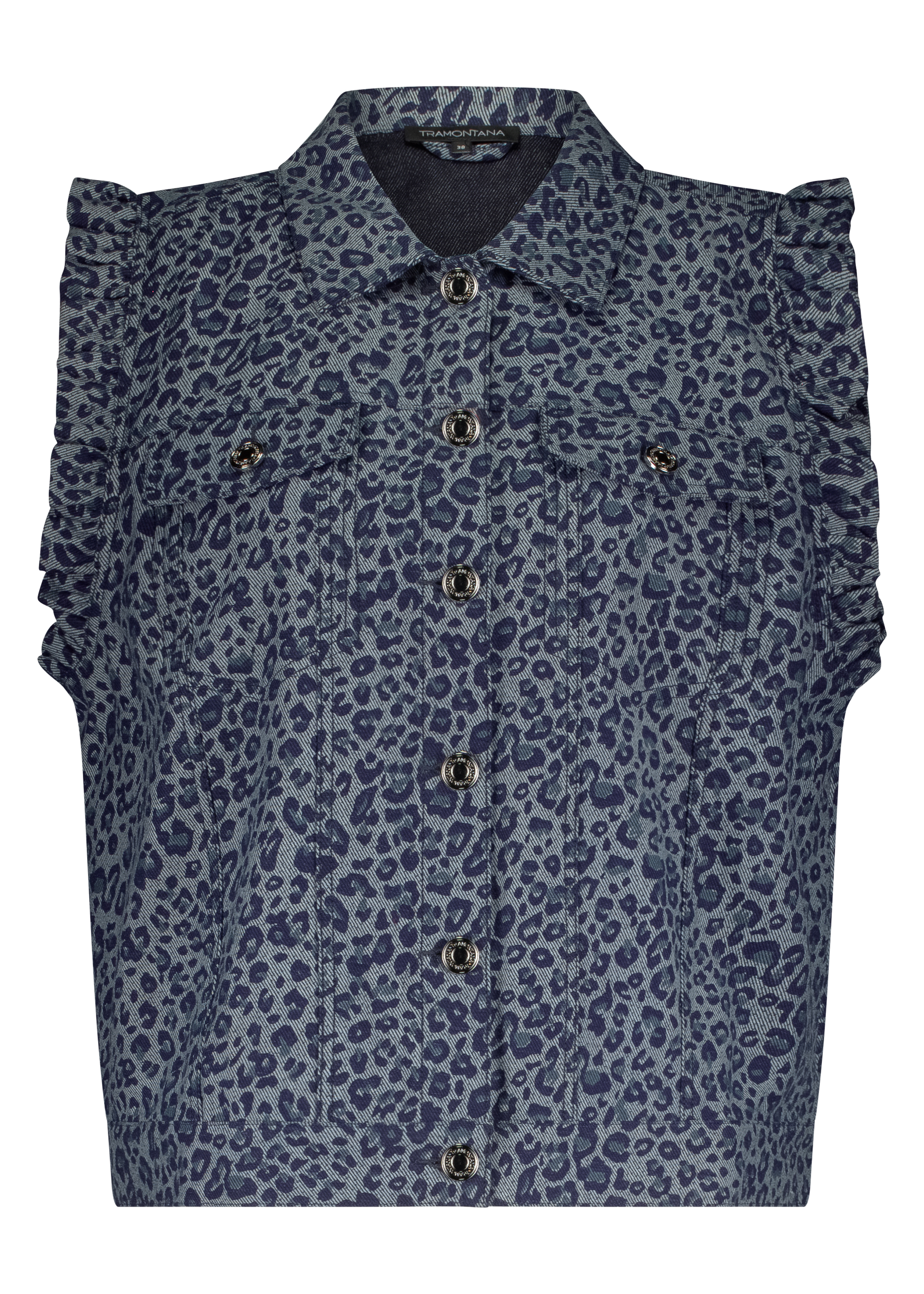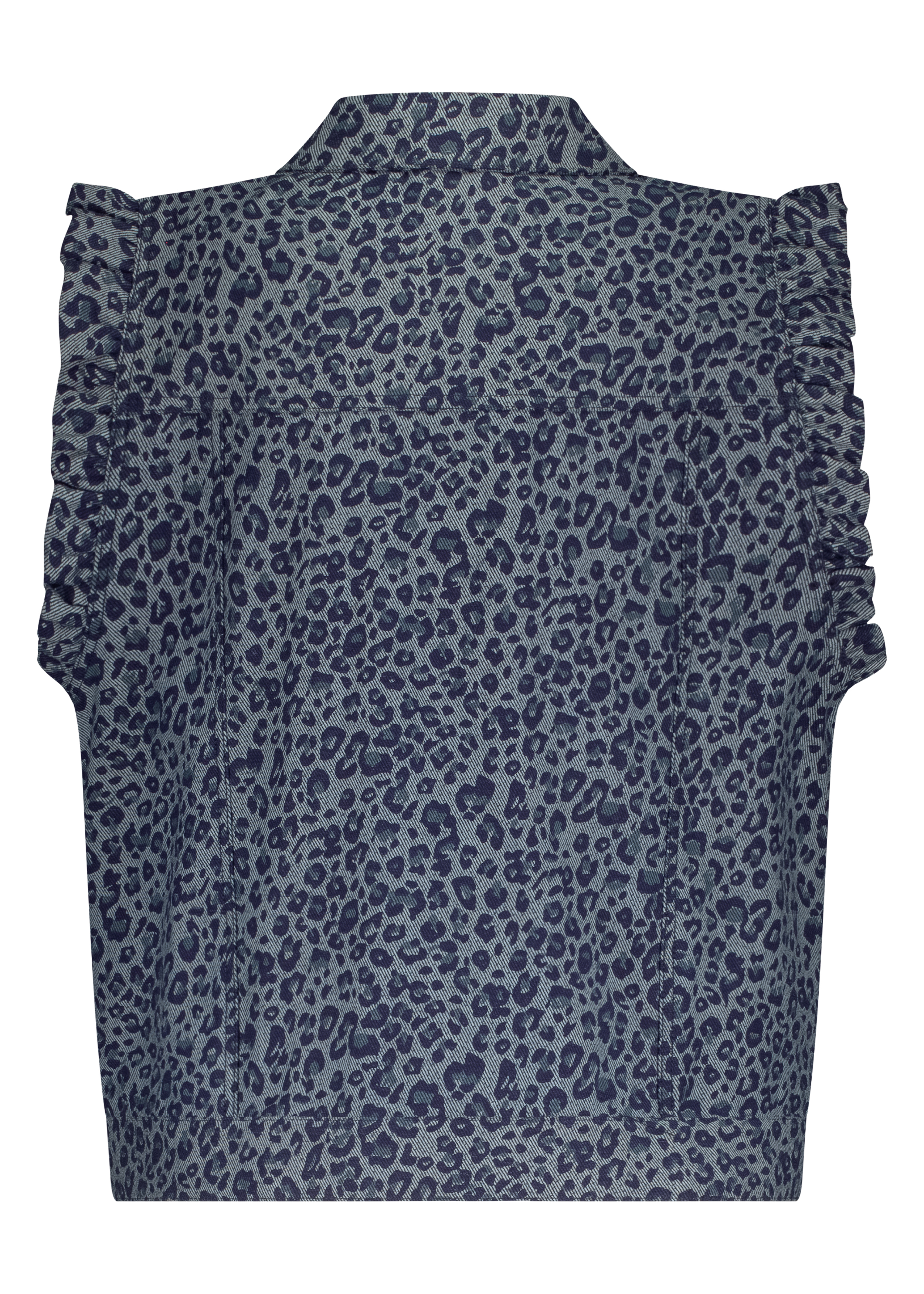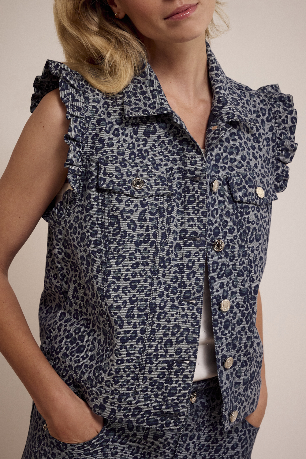 De blauwe denimbasis krijgt een verrassende twist door de ton-sur-ton leopardprint – subtiel wild, maar stijlvol en goed te combineren. De mouwloze snit maakt dit gilet perfect om over een blouse, jurk of coltrui te dragen, en voegt moeiteloos textuur toe aan je look.