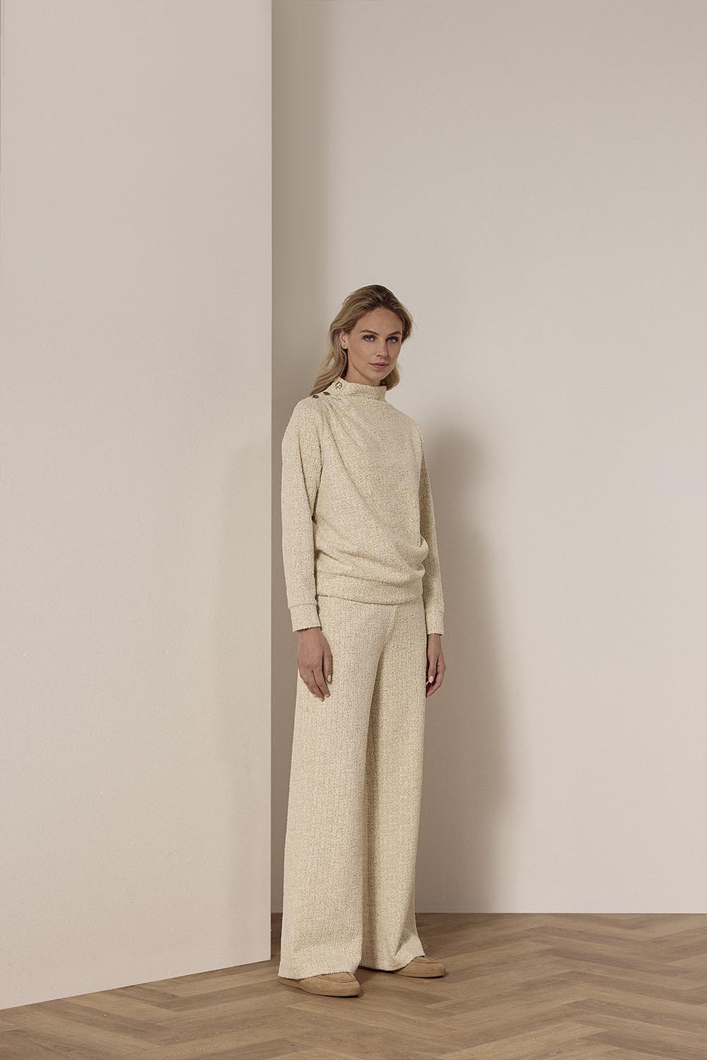 De Lurex Bouclé Wide-Leg Trousers zijn een verfijnde en comfortabele keuze voor je wintergarderobe. Gemaakt van een luxe mix van 40% katoen, 32% polyester, 12% viscose, 14% MTF en 2% elastaan, bieden deze broeken een ademende pasvorm met een lichte stretch voor ultiem comfort. De stone melange kleur geeft de broek een zachte, tijdloze uitstraling die veelzijdig te combineren is met verschillende stijlen.