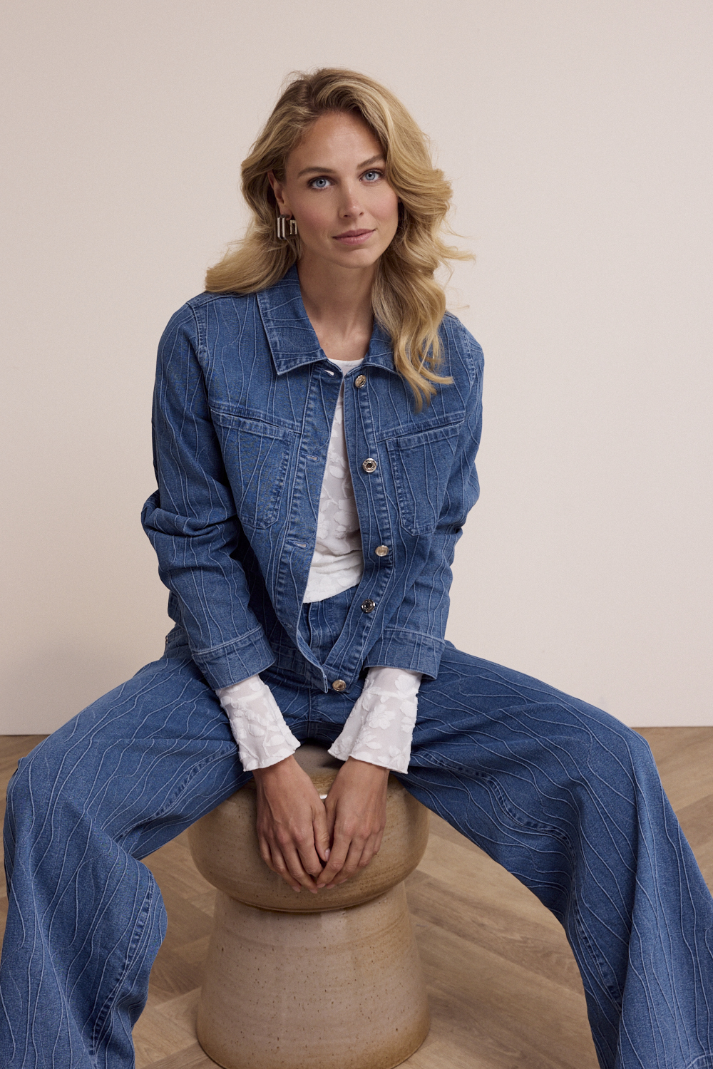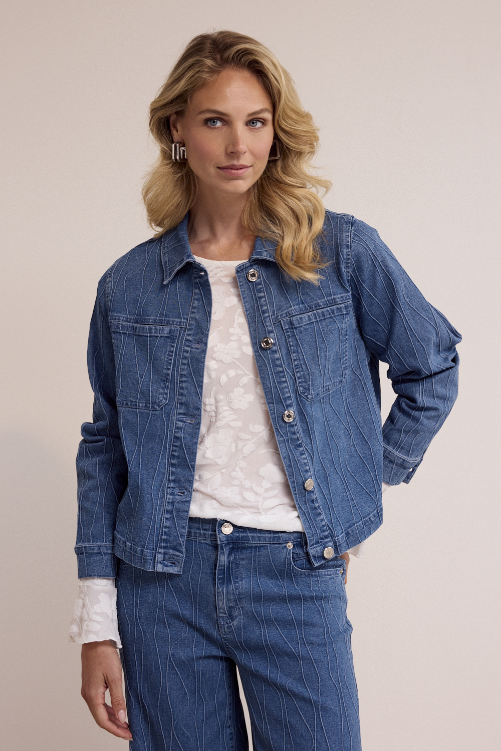 De Pintuck Pattern Denim Jacket is een modern statement piece dat moeiteloos karakter toevoegt aan elke outfit. Het jasje is gemaakt van een comfortabele stofmix van 65% katoen, 24% polyester, 10% viscose en 1% elastaan, met een voering van 100% katoen, wat zorgt voor een stevige maar soepele kwaliteit die prettig draagt en mooi in vorm blijft. Het verfijnde pintuck-patroon geeft dit denim jack een unieke, eigentijdse uitstraling, terwijl de Blue Denim wassing zorgt voor een tijdloze en veelzijdige look. Klassieke details zoals de kraag, borstzakken en knoopsluiting verwijzen naar het traditionele denim design, maar krijgen door de subtiele structuur in de stof een moderne update. De rechte pasvorm maakt het jasje makkelijk te combineren en geschikt voor verschillende gelegenheden. Draag de Pintuck Pattern Denim Jacket over een top of trui voor een casual uitstraling, of combineer het met de bijpassende pintuck denim broek voor een stijlvolle set. Dit denim jack vormt een perfecte balans tussen klassiek en modern en is een sterke toevoeging aan elke garderobe.