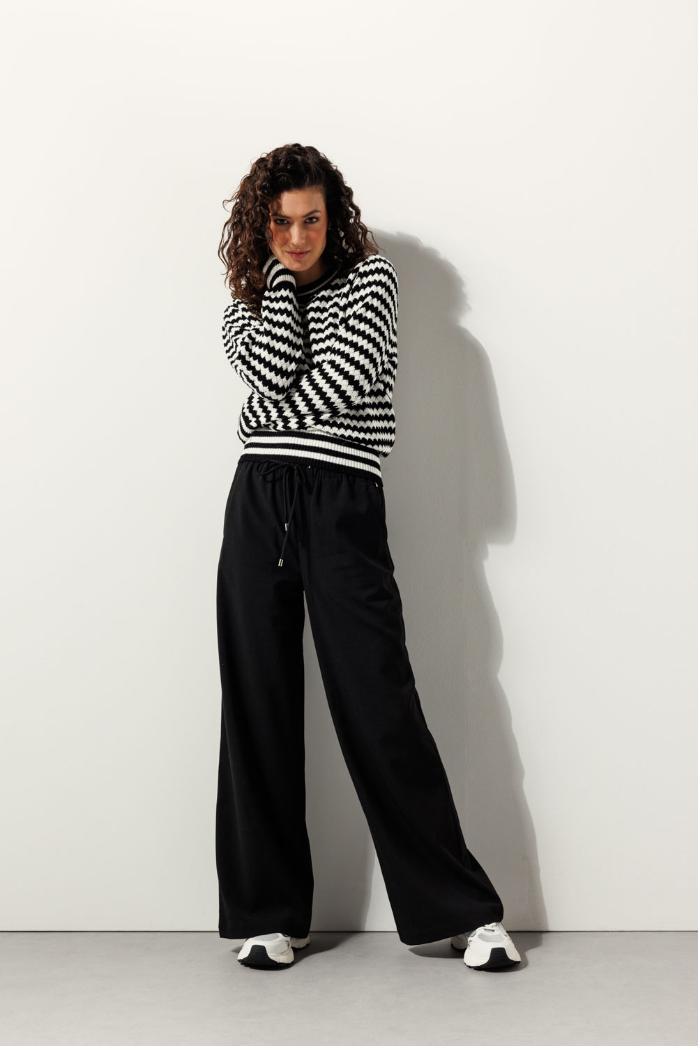 De Relaxed Wide-Leg Trousers, gemaakt van 70% polyester, 26% viscose en 4% elastaan, combineert elegantie met comfort. Verkrijgbaar in sand melange en black, een perfecte keuze voor elke gelegenheid.