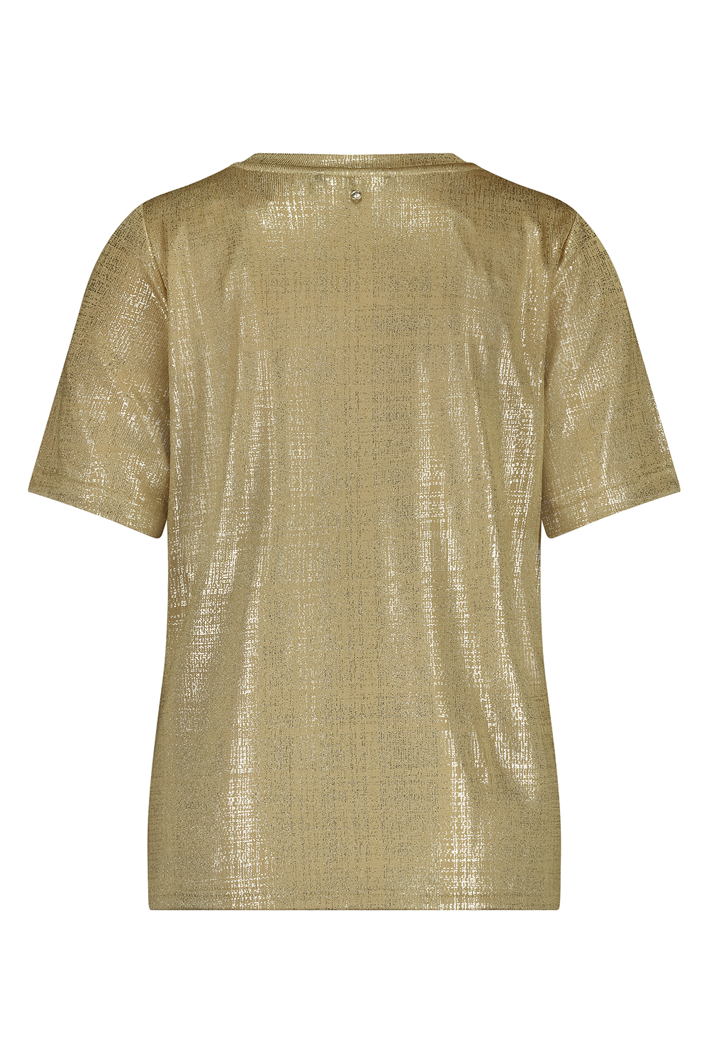 De warme camelkleur (002800) krijgt extra diepte door de verfijnde shimmer in de stof, die net genoeg licht vangt om op te vallen zonder te overdrijven. De korte mouwen en eenvoudige snit maken het een veelzijdig item dat je gemakkelijk kunt combineren.