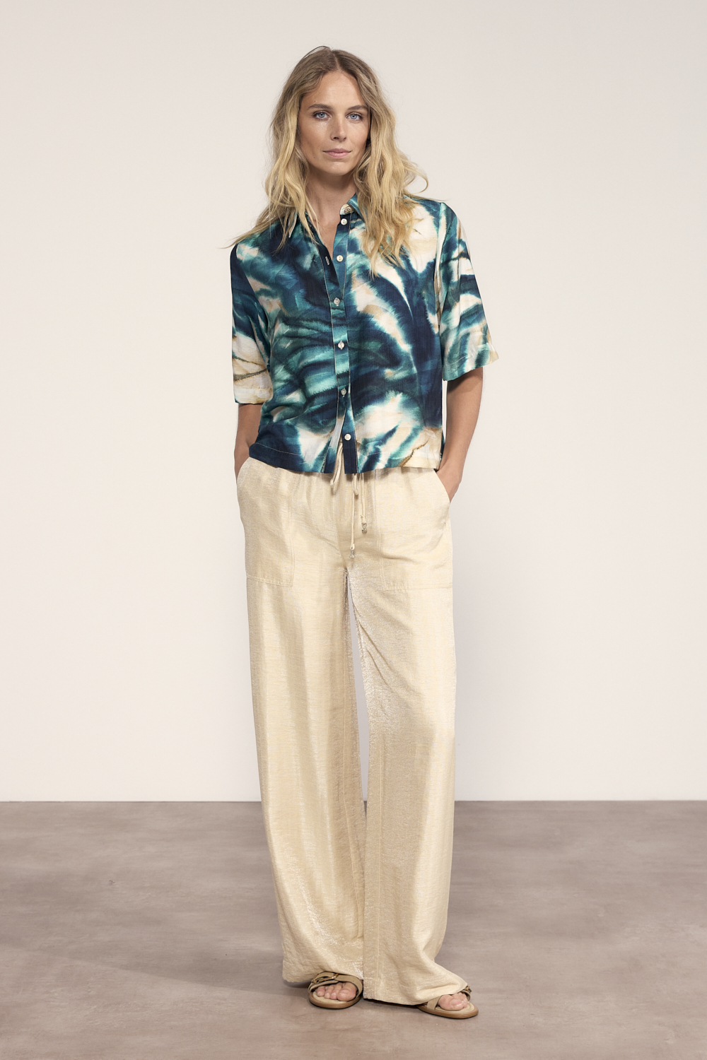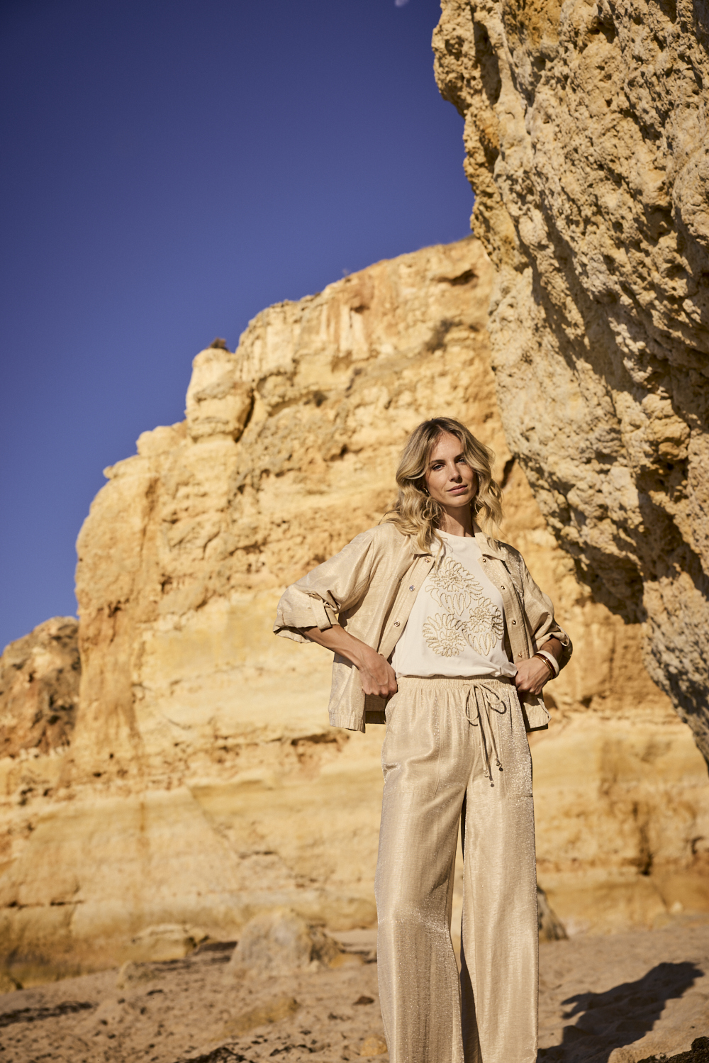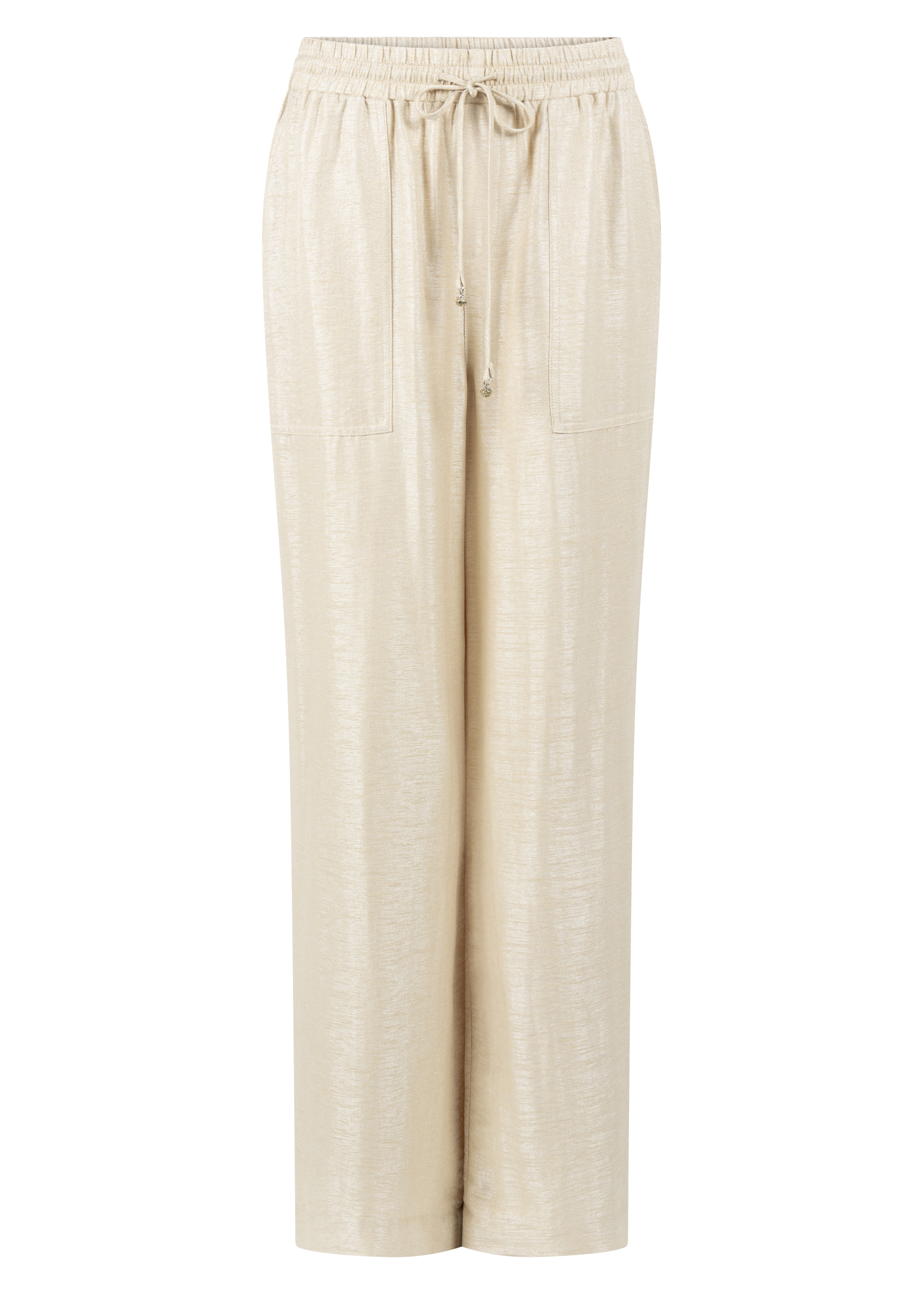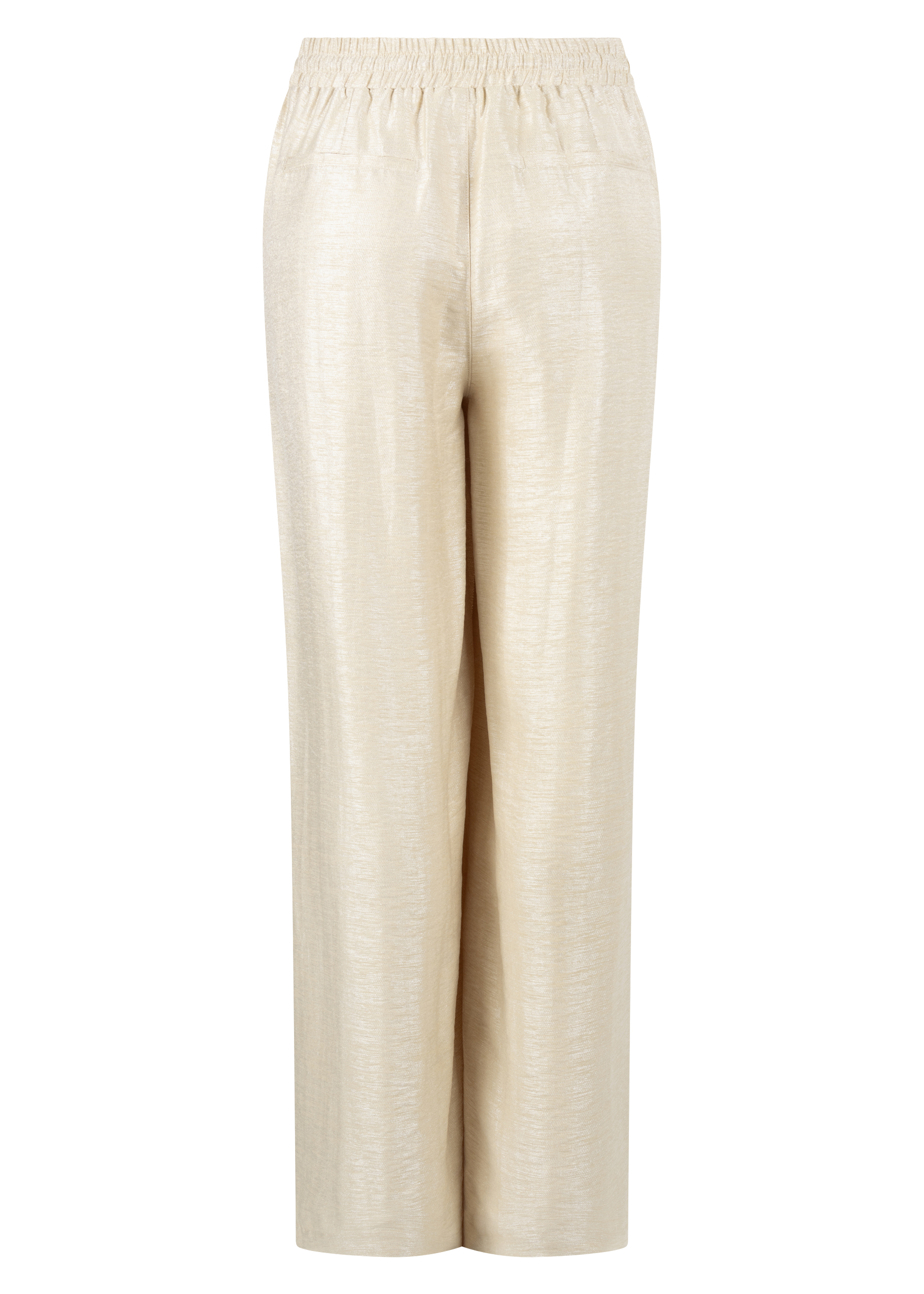 De Shimmer Wide-Leg Trousers is een elegante en moderne broek met een subtiele glans en een verfijnd, vrouwelijk silhouet. Deze trousers is vervaardigd uit een comfortabele stofmix van 85% katoen en 15% polyamide, wat zorgt voor een ademend draaggevoel, een lichte structuur en een prettige bewegingsvrijheid. De shimmer finish geeft het ontwerp een luxe en eigentijdse uitstraling, terwijl de wide-leg pasvorm zorgt voor een vloeiende, elegante valling en een flatterend silhouet. De elastische tailleband met strikkoord voegt extra comfort toe en maakt de broek zowel praktisch als stijlvol. Uitgevoerd in de zachte, neutrale kleur Pebble is deze trousers moeiteloos te combineren met verschillende looks. Draag de Shimmer Wide-Leg Trousers met een bijpassende top of jacket voor een stijlvolle co-ord look, of combineer met een blouse of knit voor een moderne, casual-chique outfit. Een veelzijdige broek die comfort, subtiele glans en eigentijdse elegantie perfect samenbrengt.