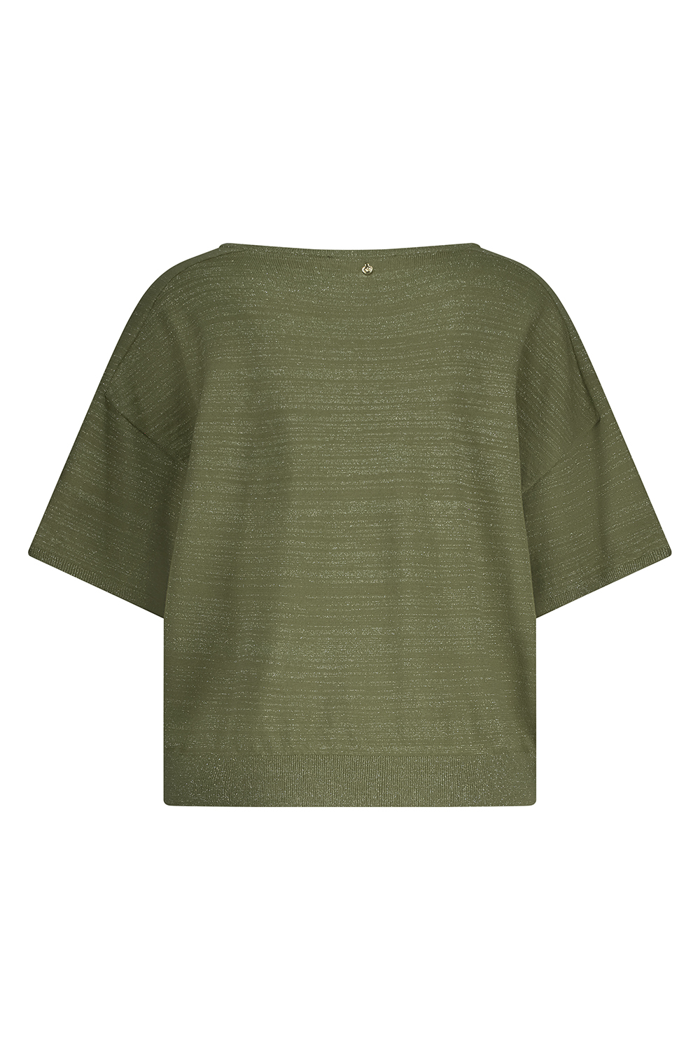 De korte mouwen en compacte snit maken deze jumper perfect om los te dragen of te layeren onder een vest of blazer. De kleur Moss (006501) voegt diepte toe, terwijl de lurex in het breisel zorgt voor een verfijnde, sprankelende finish.