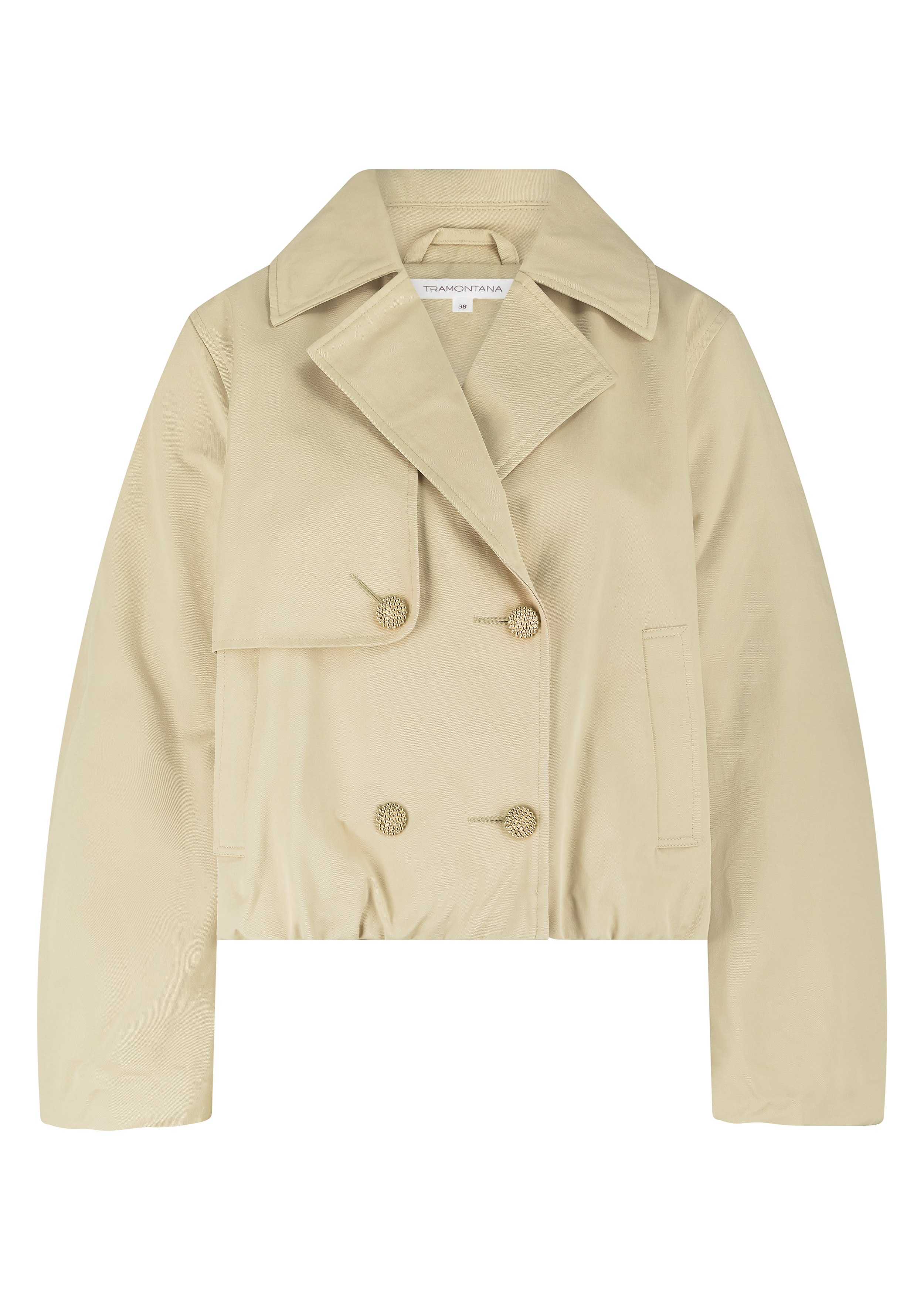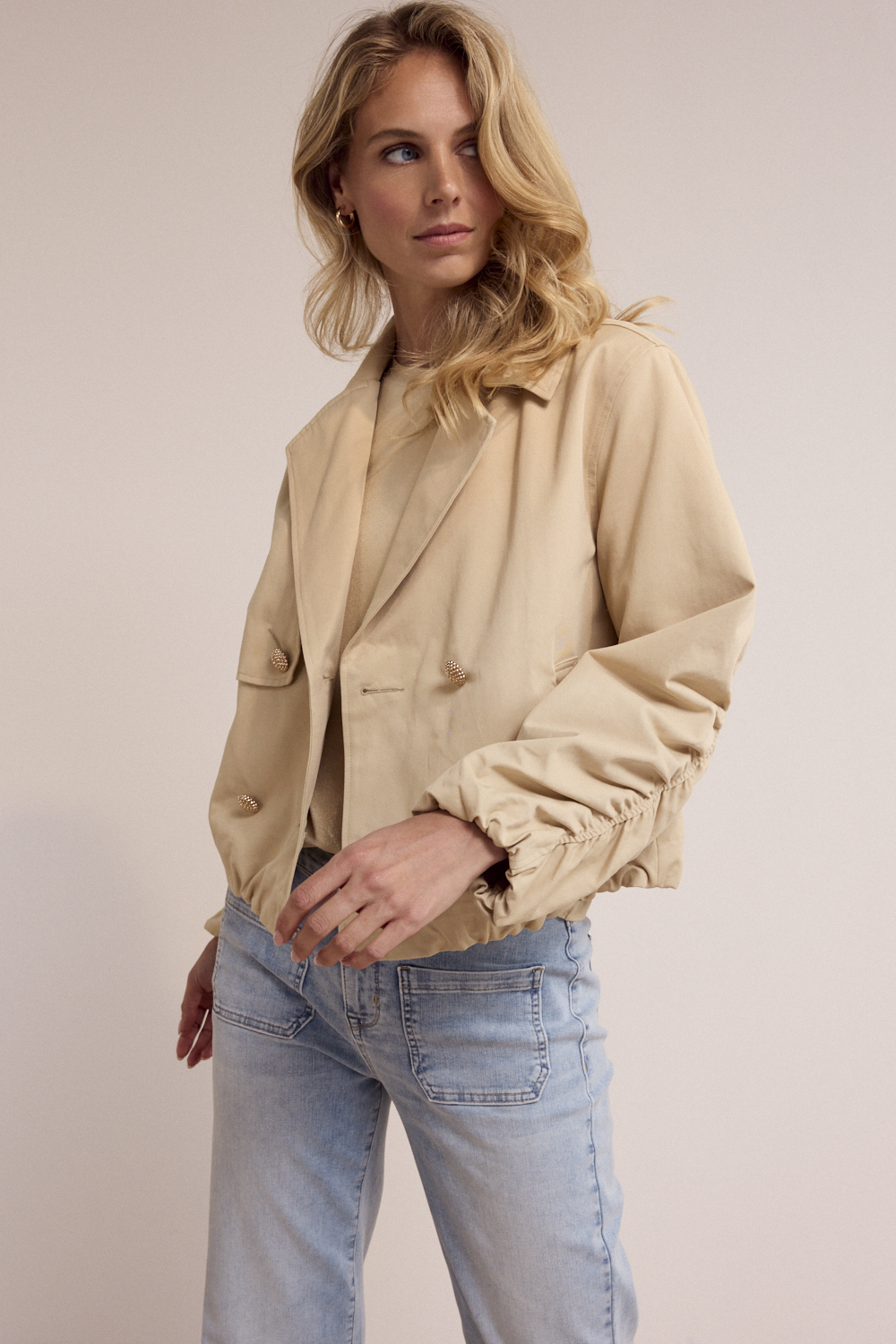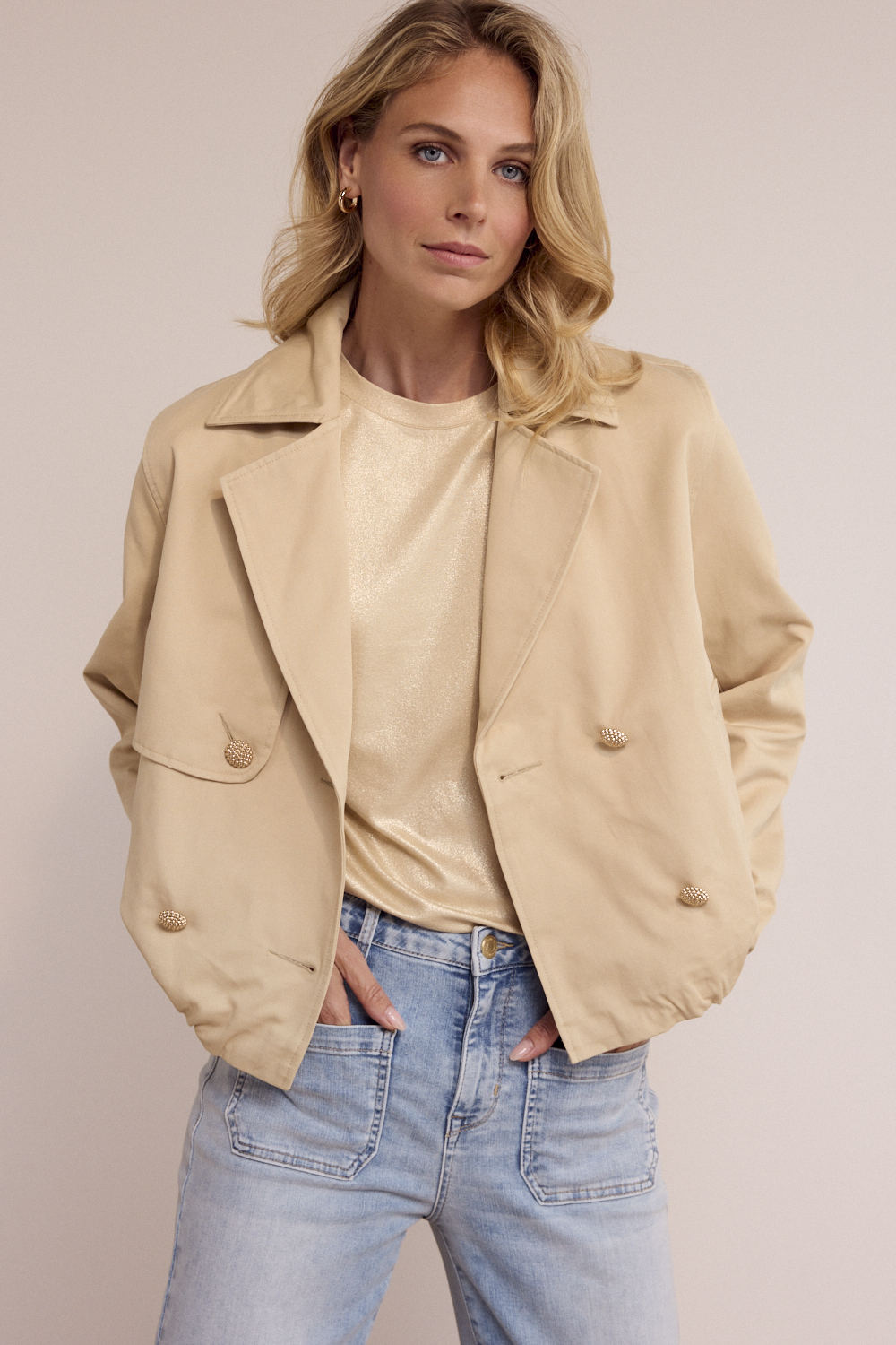 De Short Trench Jacket is een moderne en vrouwelijke interpretatie van de klassieke trenchcoat, met een frisse en eigentijdse uitstraling. Deze jacket is uitgevoerd in een hoogwaardige materiaalcombinatie van 100% katoen en 100% polyester, wat zorgt voor een comfortabel draaggevoel, een mooie structuur en een duurzame kwaliteit. De korte lengte geeft het ontwerp een moderne twist, terwijl de klassieke trenchdetails, zoals de reverskraag, dubbele knoopsluiting en subtiele schouderdetails, zorgen voor een tijdloze basis. De licht volumineuze mouwen en verfijnde afwerking geven het jasje een elegante, vrouwelijke touch. Uitgevoerd in de zachte, neutrale kleur Pebble is deze jacket perfect te combineren met zowel lichte als donkere tinten. Draag de Short Trench Jacket over een top of knit met denim voor een moderne everyday look, of combineer met een jurk of pantalon voor een stijlvolle, city-chique uitstraling. Een veelzijdige jacket die klassiek design en eigentijdse elegantie moeiteloos samenbrengt.