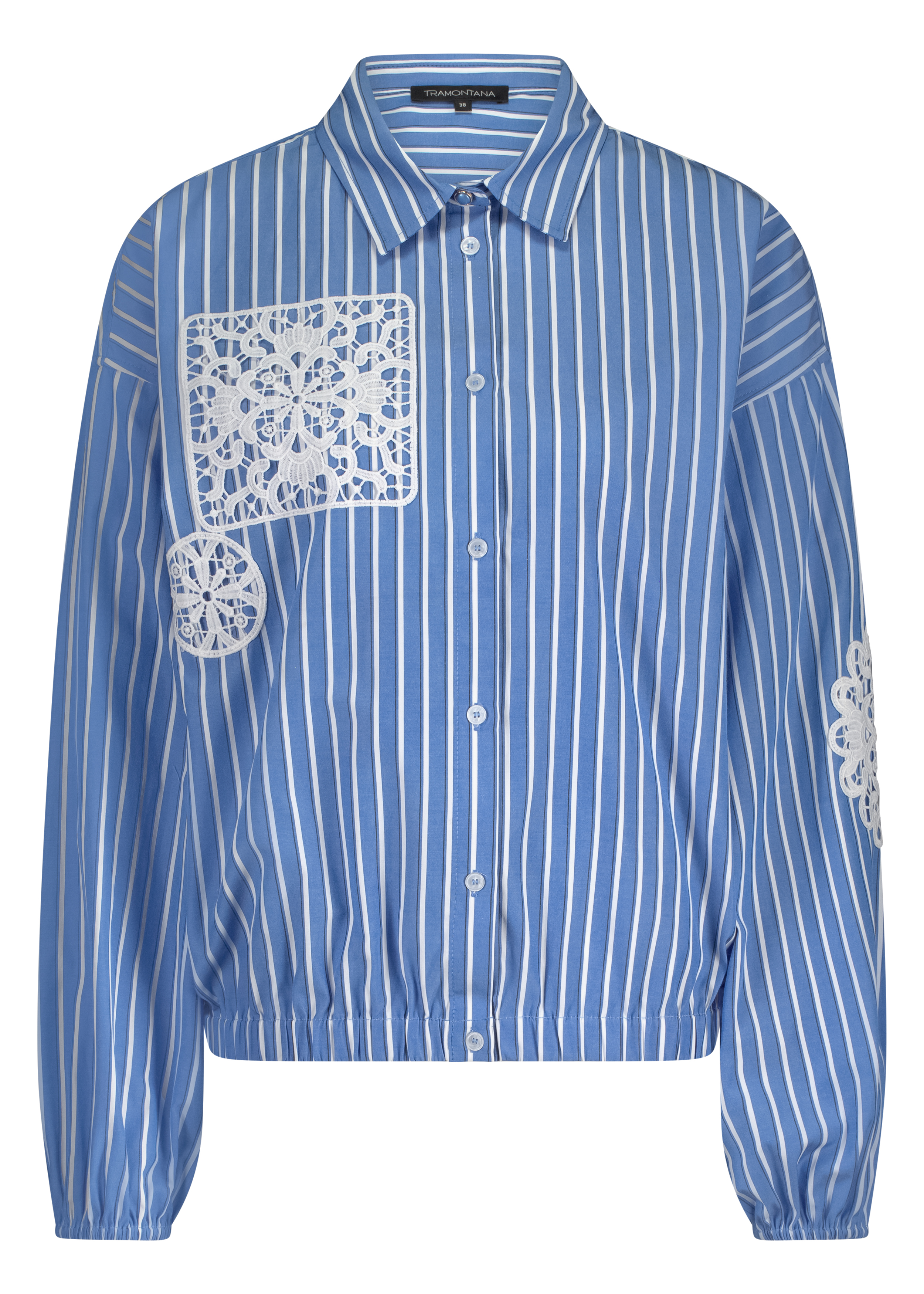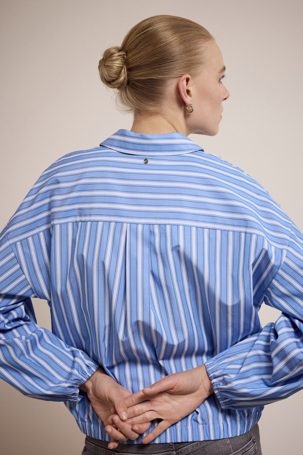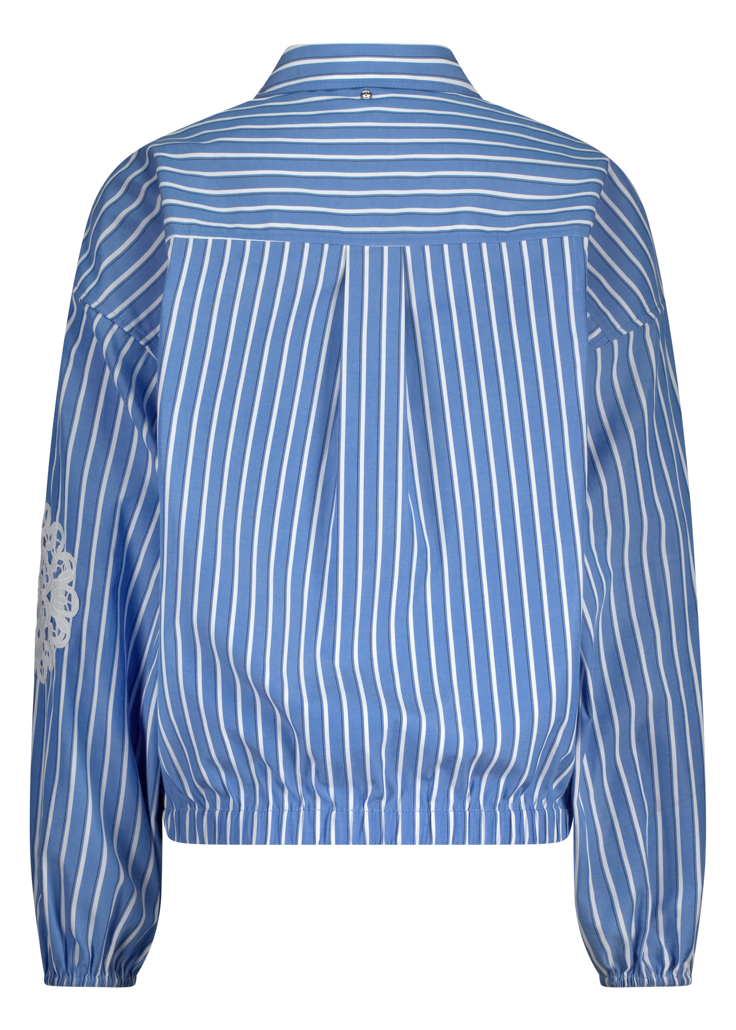 De patchworkopbouw met verschillende streeppatronen in Cornflower-blauw (005009 – Cornflower) creëert een uniek, eigentijds effect. Het samenspel van lijnen en panelen geeft de blouse een dynamische uitstraling zonder druk te zijn.