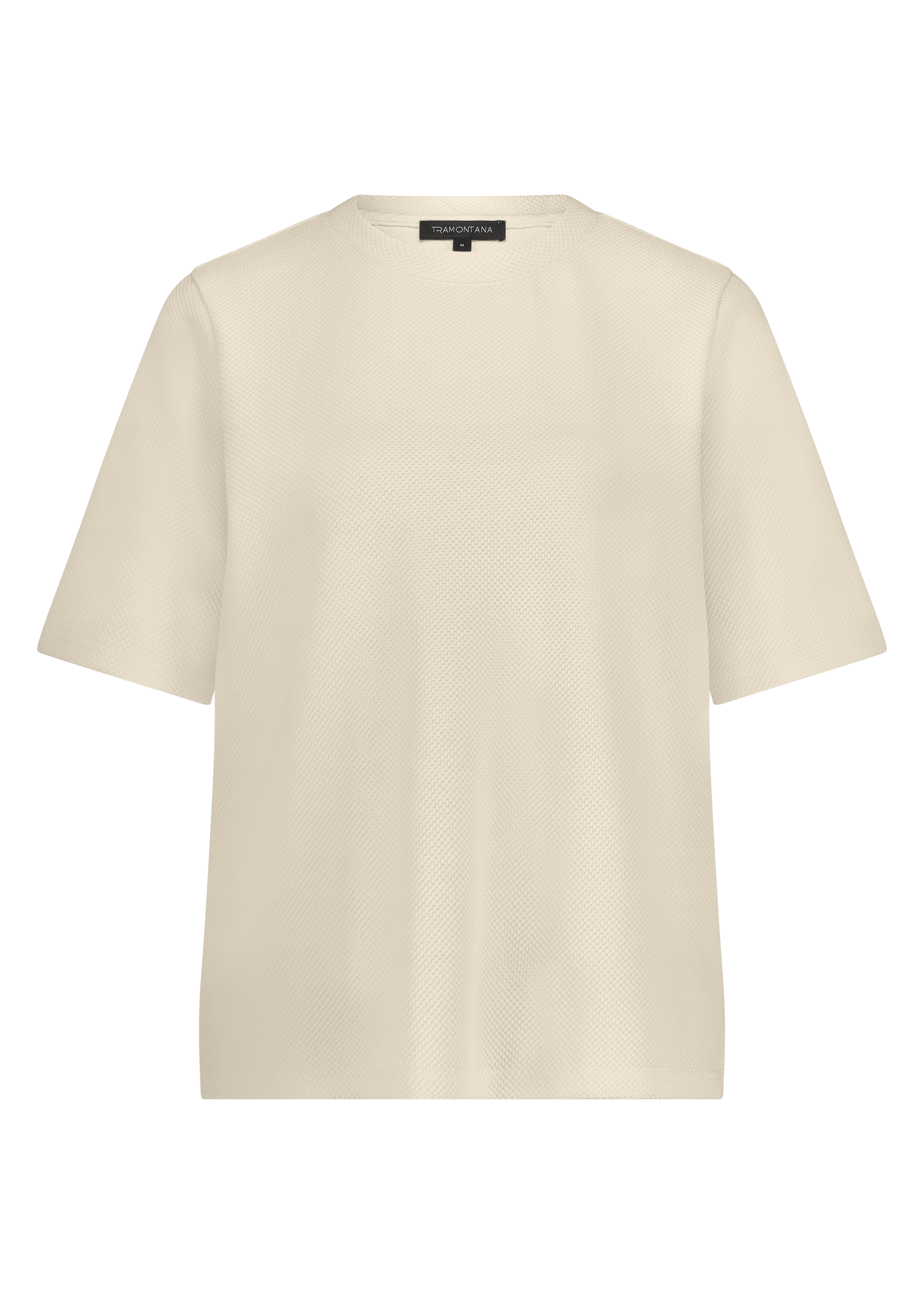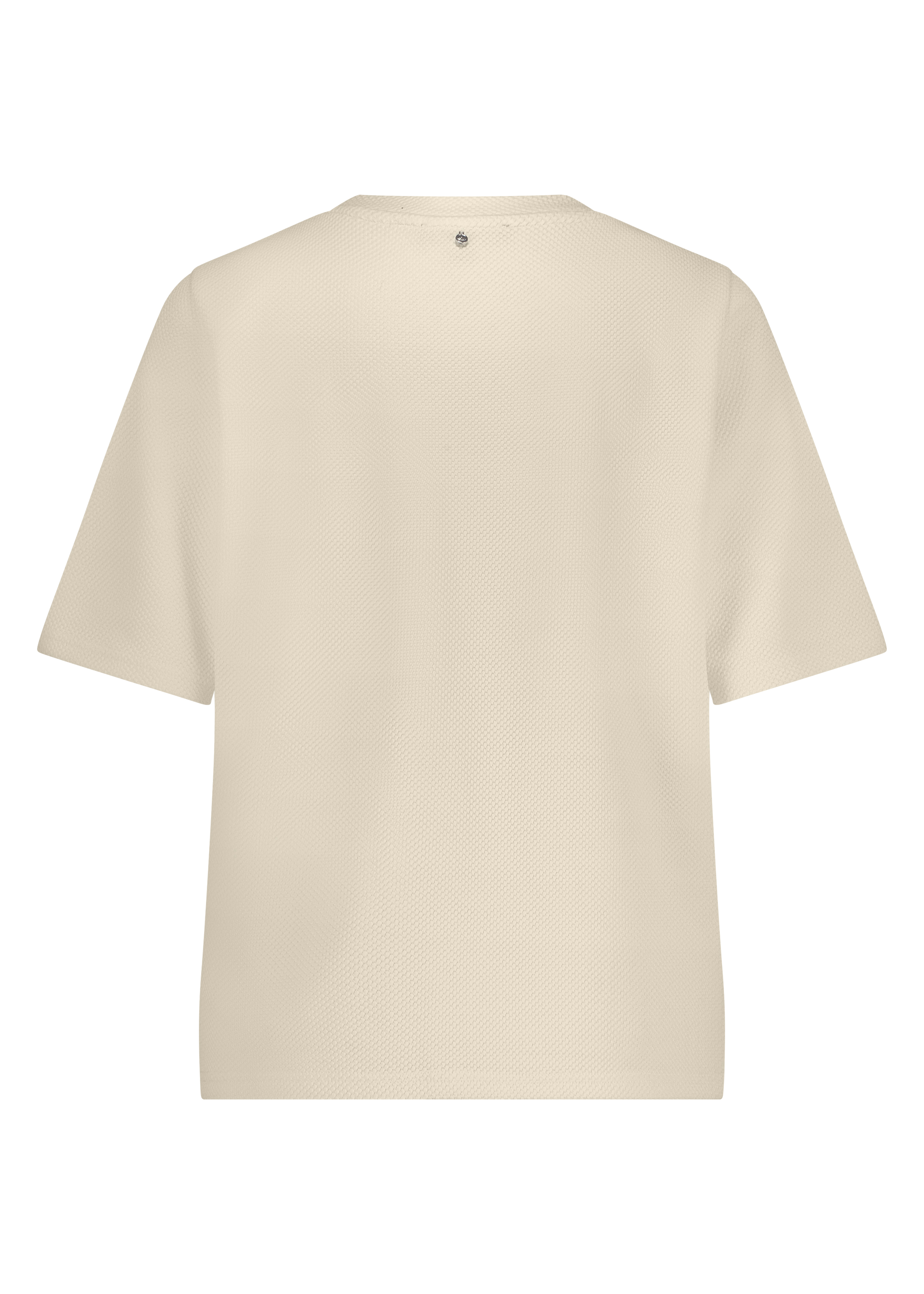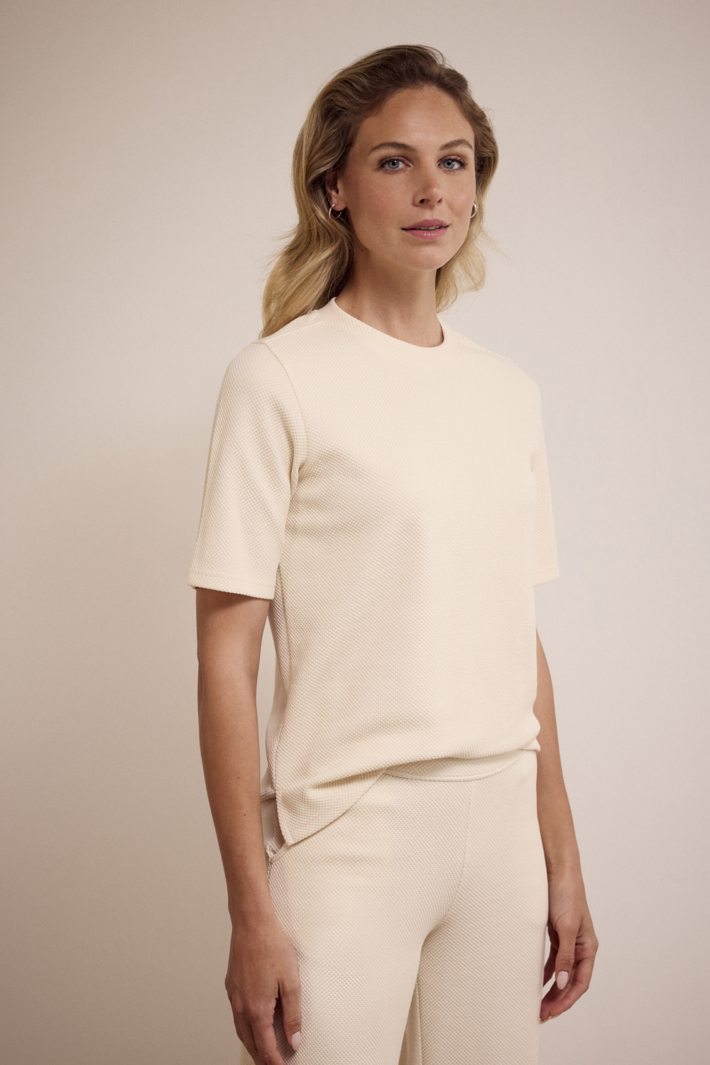 Dankzij de minimalistische snit en korte mouwen is dit een veelzijdig item dat je zowel netjes als casual kunt stylen. De structuur in de stof geeft de top net dat beetje extra, zonder op te vallen. Verkrijgbaar in Moss, Stone en Black – drie kleuren die moeiteloos matchen met je herfstgarderobe.
