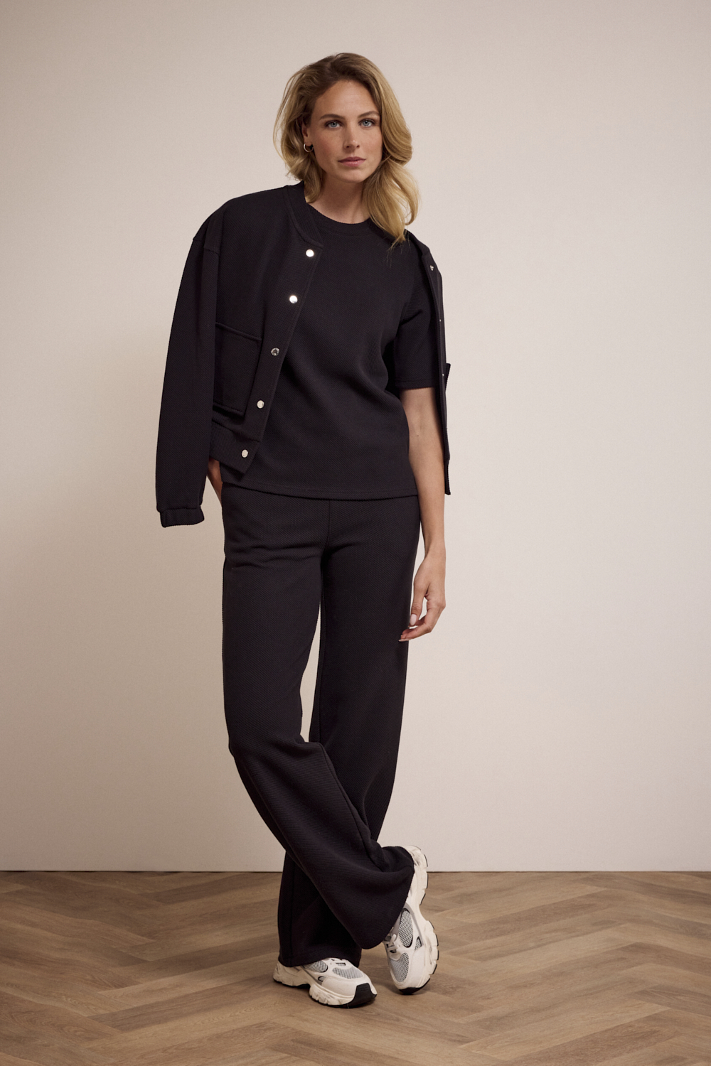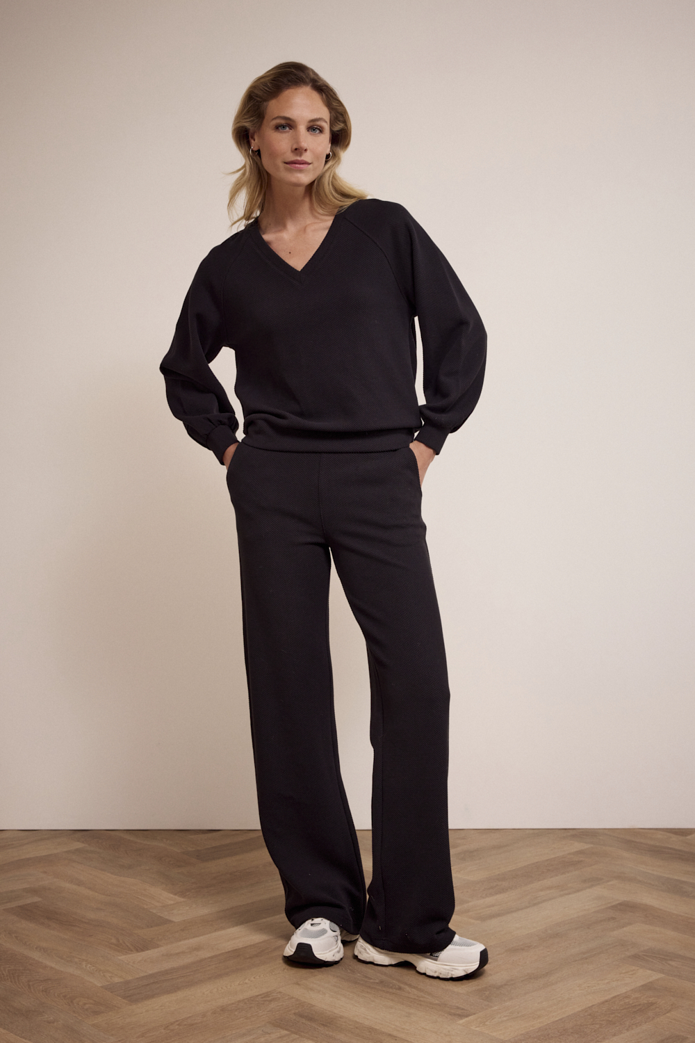 De wijde pijpen zorgen voor een elegant, modern silhouet, terwijl de cleane afwerking het geheel een verzorgde uitstraling geeft. Verkrijgbaar in Moss, Stone en Black – drie tijdloze kleuren die makkelijk te combineren zijn met verschillende stijlen en materialen.