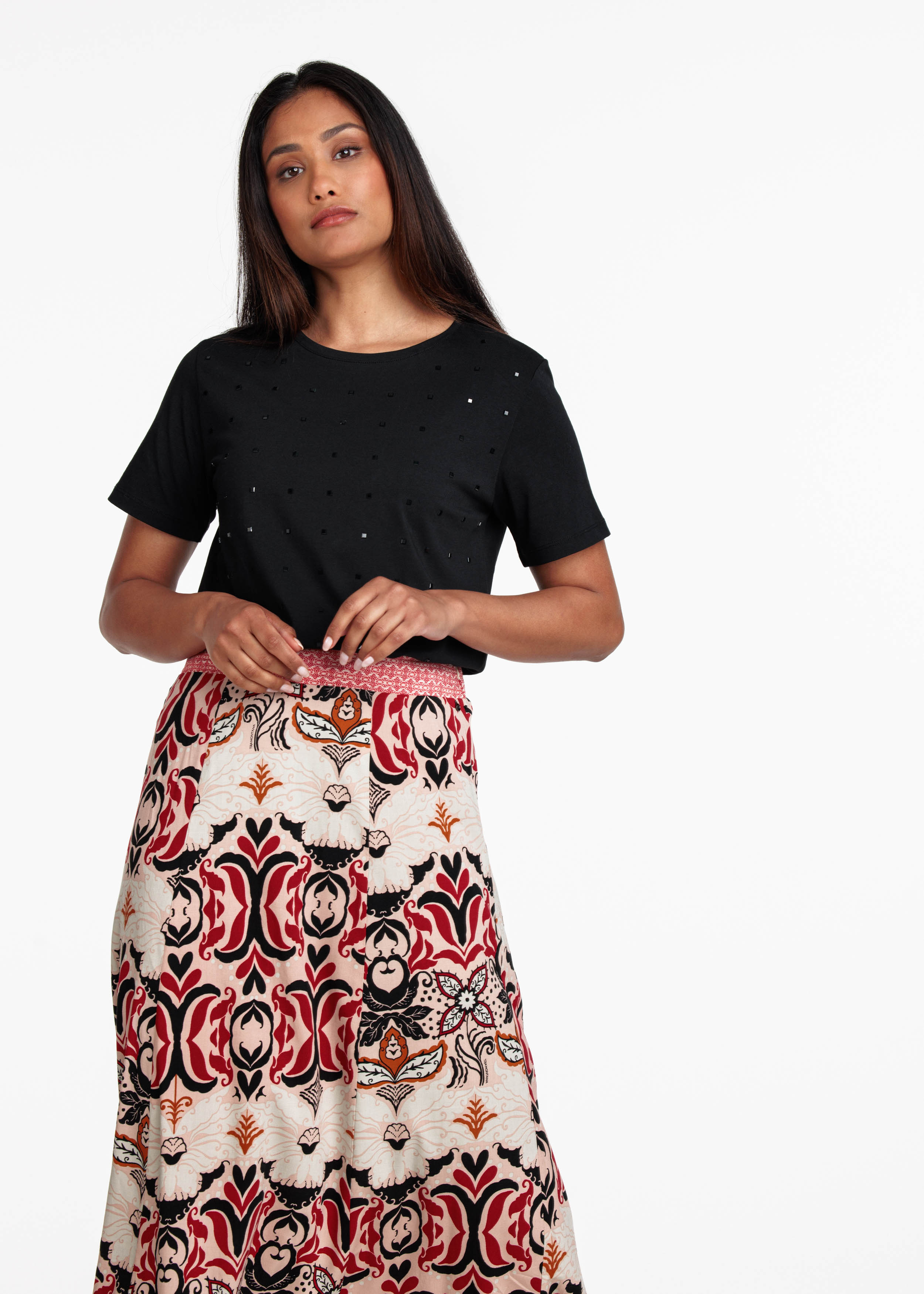 Licht getailleerd katoenen ronde hals T-shirt met korte mouw. De voorzijde is 'all over' voorzien van ton sur ton studs.