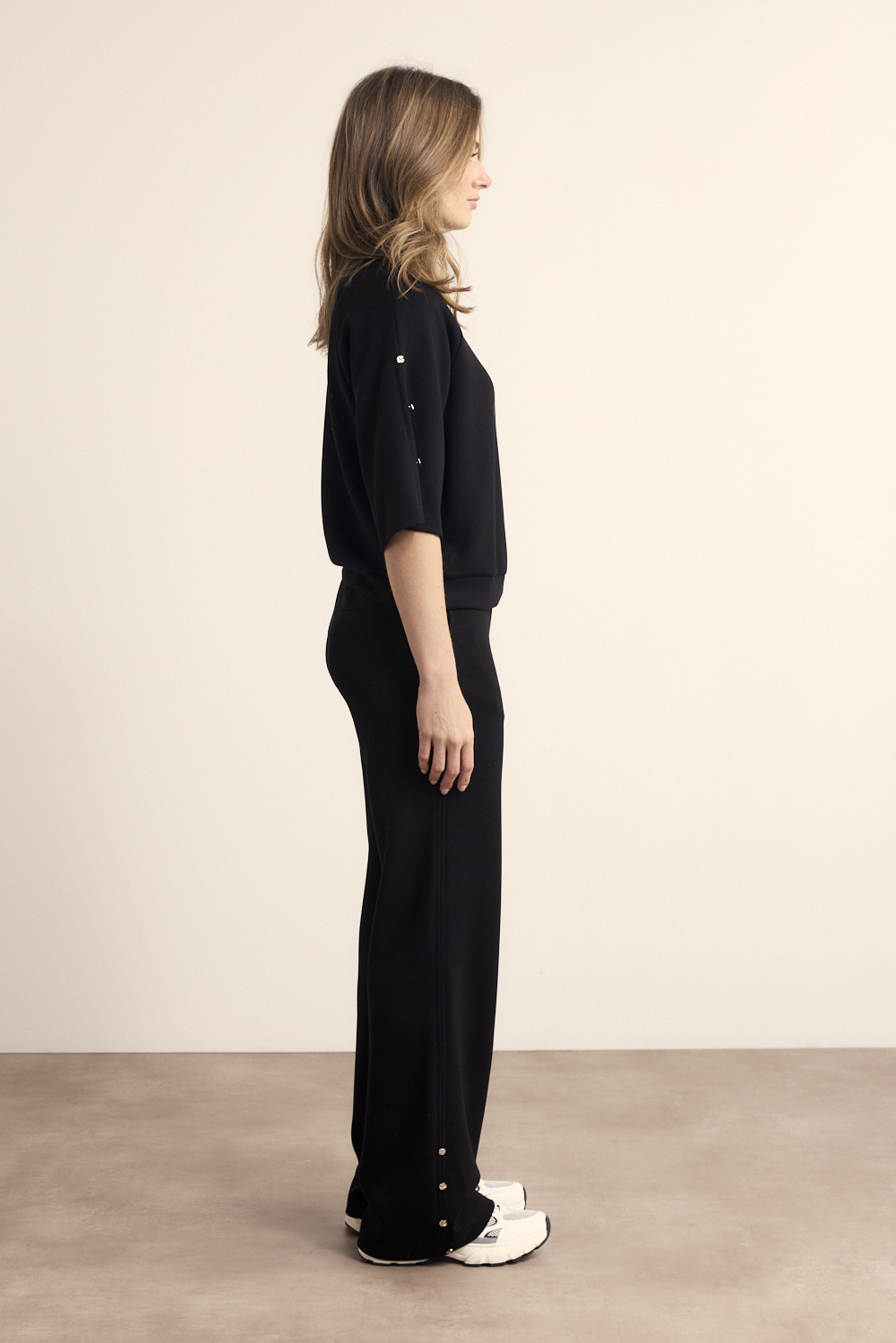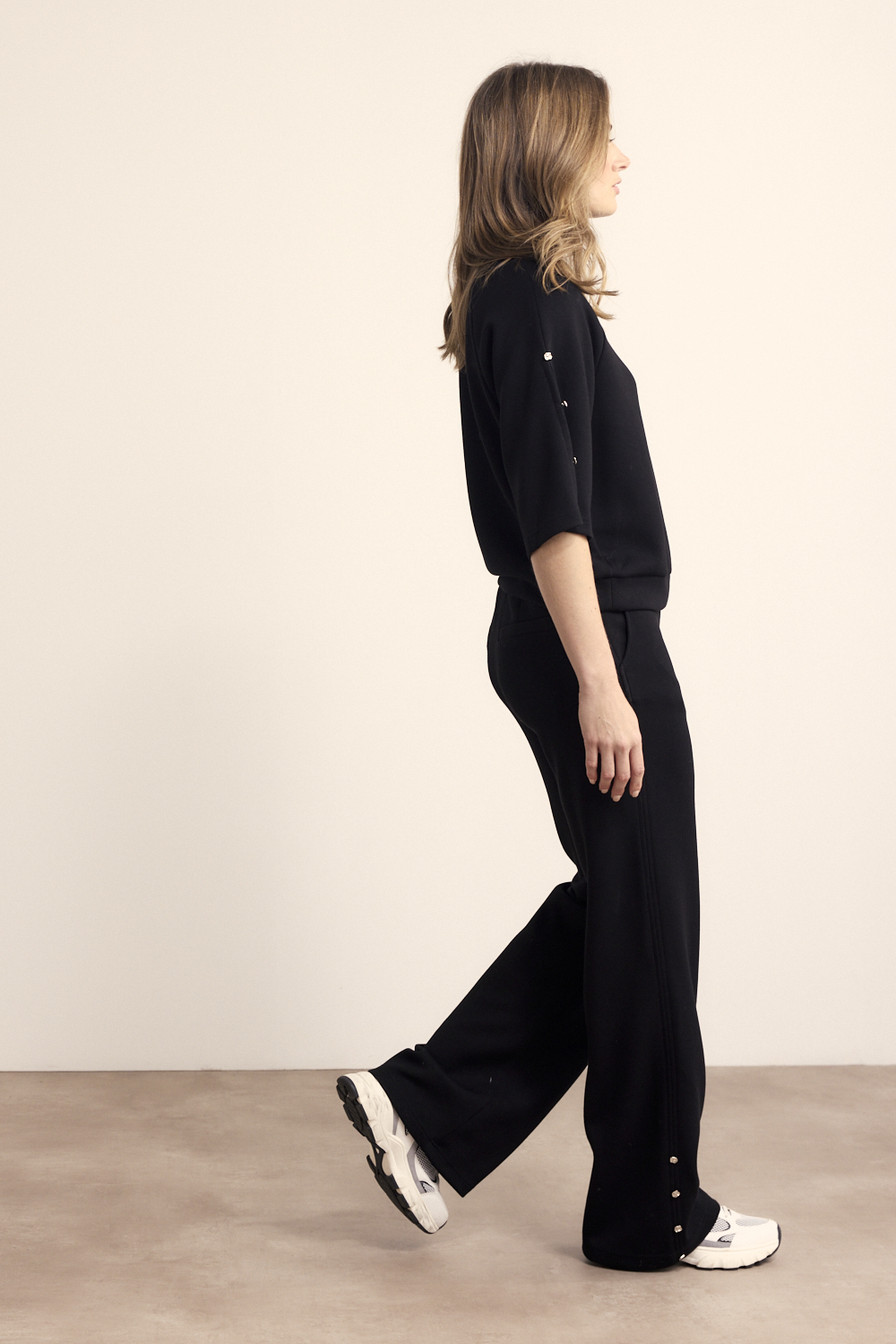 De Technical Sweat Trousers combineren comfort met een moderne, verfijnde uitstraling en zijn ideaal voor een stijlvolle dagelijkse look. Deze broek is gemaakt van een soepele stofmix van 55% viscose, 40% polyester en 5% elastaan, wat zorgt voor een zachte touch, goede ademende eigenschappen en een lichte stretch voor extra draagcomfort. Verkrijgbaar in zowel Emerald als Black, biedt deze broek een frisse, eigentijdse optie én een tijdloze klassieker die eenvoudig te combineren is met diverse outfits. De rechte pijpen creëren een elegant silhouet, terwijl de subtiele drukknopen langs de onderzijde van de pijpen een speels en modieus detail toevoegen. Dankzij de comfortabele tailleband en de soepel vallende stof beweegt de broek moeiteloos met je mee, waardoor hij geschikt is voor zowel ontspannen als meer geklede momenten. Combineer de Technical Sweat Trousers met de bijpassende top voor een moderne co-ord look of draag hem met een eenvoudige blouse of knitwear voor een stijlvolle, comfortabele outfit. Deze broek is een perfecte balans tussen fashion en functionaliteit en een waardevolle aanvulling op elke garderobe.