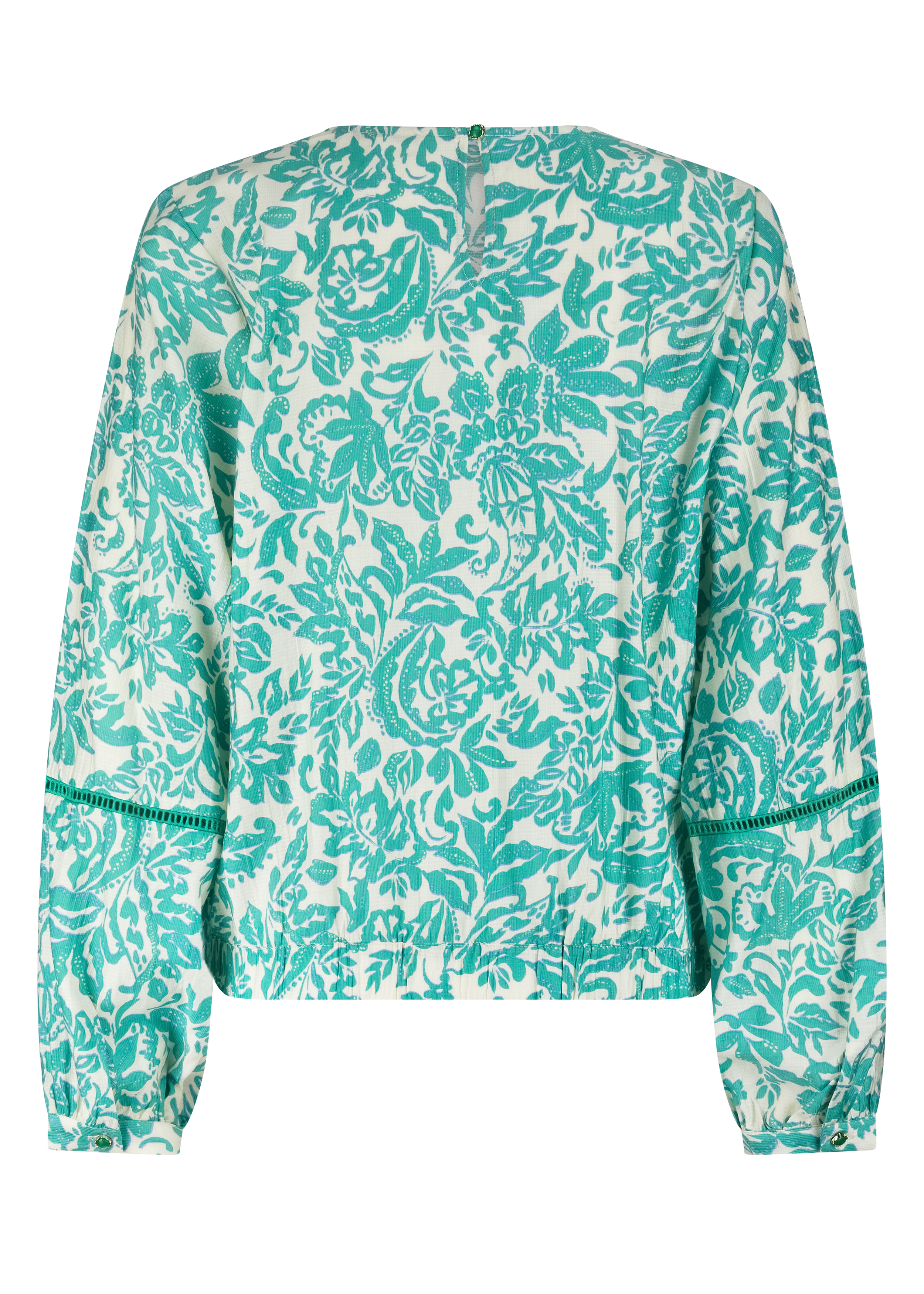 De Top Emerald Flourish is een verfijnde en vrouwelijke top met een frisse, elegante uitstraling. Deze top is gemaakt van een soepele en lichtgewicht stofmix van 82% viscose en 18% polyamide, wat zorgt voor een comfortabel draaggevoel en een mooie valling. De opvallende Emerald Flourish print in de kleur Print Emerald geeft het ontwerp een speels en stijlvol karakter en maakt deze top tot een echte eyecatcher. De ronde hals met subtiele split en knoopsluiting aan de achterzijde zorgt voor een verfijnde afwerking, terwijl de lange mouwen met decoratieve inzetdetails een extra elegant accent toevoegen. De striksluiting aan de onderzijde geeft de top een vrouwelijke touch en biedt de mogelijkheid om de pasvorm naar wens aan te passen. Combineer de Top Emerald Flourish met een jeans voor een casual look of draag hem met een elegante broek of rok voor een meer geklede outfit. Deze top is een veelzijdig item dat moeiteloos kleur en stijl toevoegt aan elke garderobe.