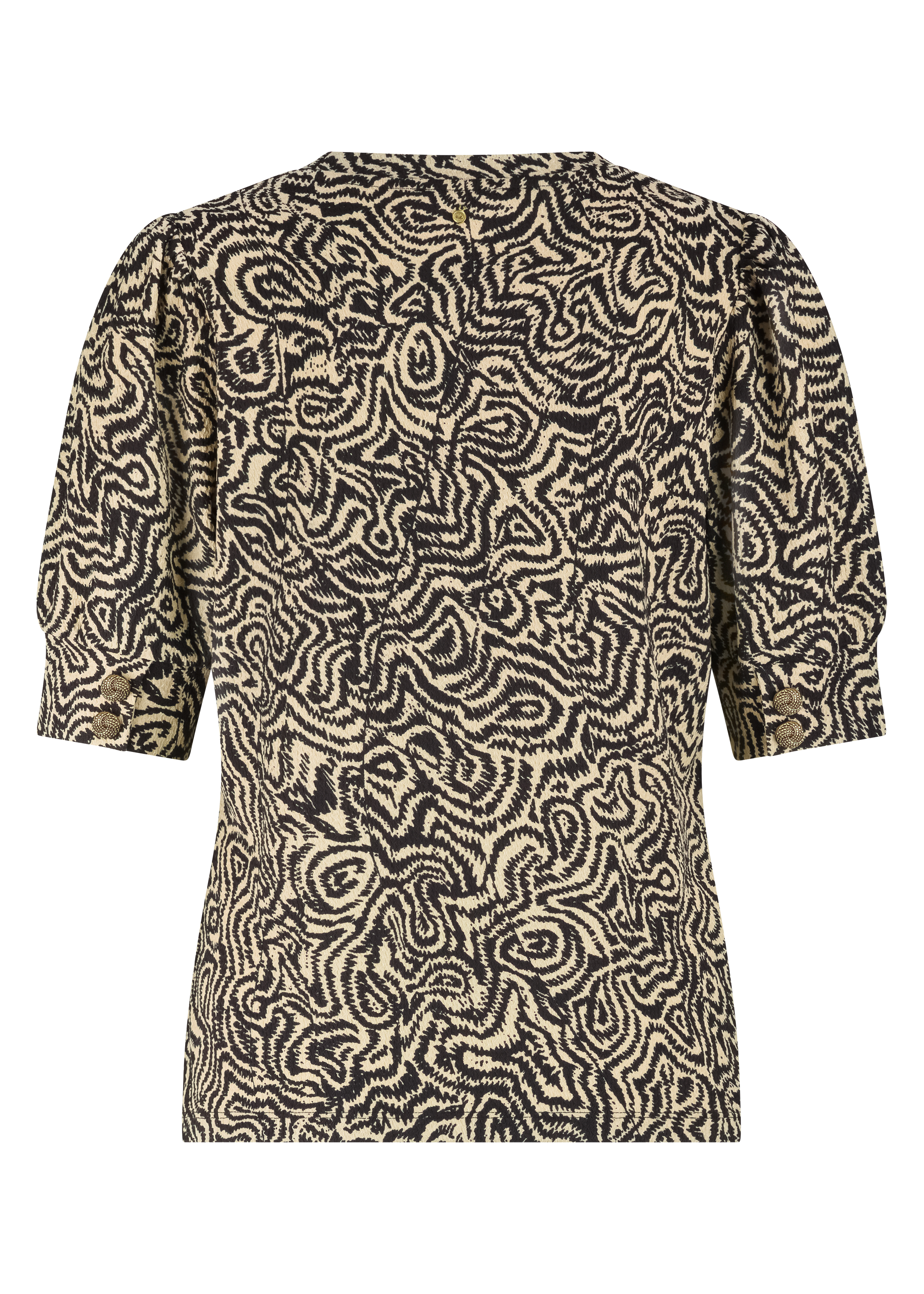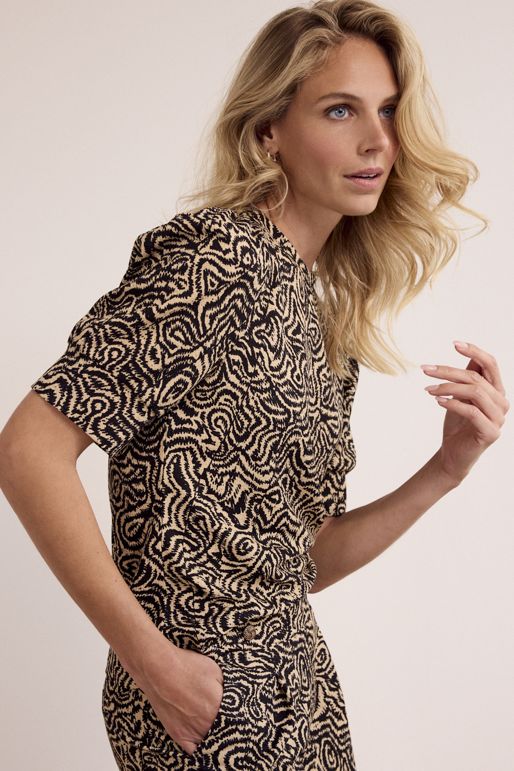 De Top Wandering Lines is een eigentijdse en vrouwelijke top met een opvallend grafisch dessin en een verfijnd silhouet. Deze top is vervaardigd uit een comfortabele en soepele stofmix van 95% polyester en 5% elastaan, wat zorgt voor een prettig draaggevoel, lichte stretch en een mooie valling. Het abstracte Wandering Lines dessin in Black & Pebble geeft de top een moderne, artistieke uitstraling en maakt dit item direct tot een eyecatcher. De ronde hals en halflange mouwen met subtiele volume-details zorgen voor een elegante, vrouwelijke balans. De licht aangesloten pasvorm valt mooi om het lichaam en maakt de top zowel comfortabel als flatterend. Draag de Top Wandering Lines als set met de bijpassende trousers voor een krachtige statement look, of combineer met een effen broek of rok voor een stijlvolle, moderne outfit. Een veelzijdige top die print, comfort en eigentijdse elegantie moeiteloos samenbrengt.