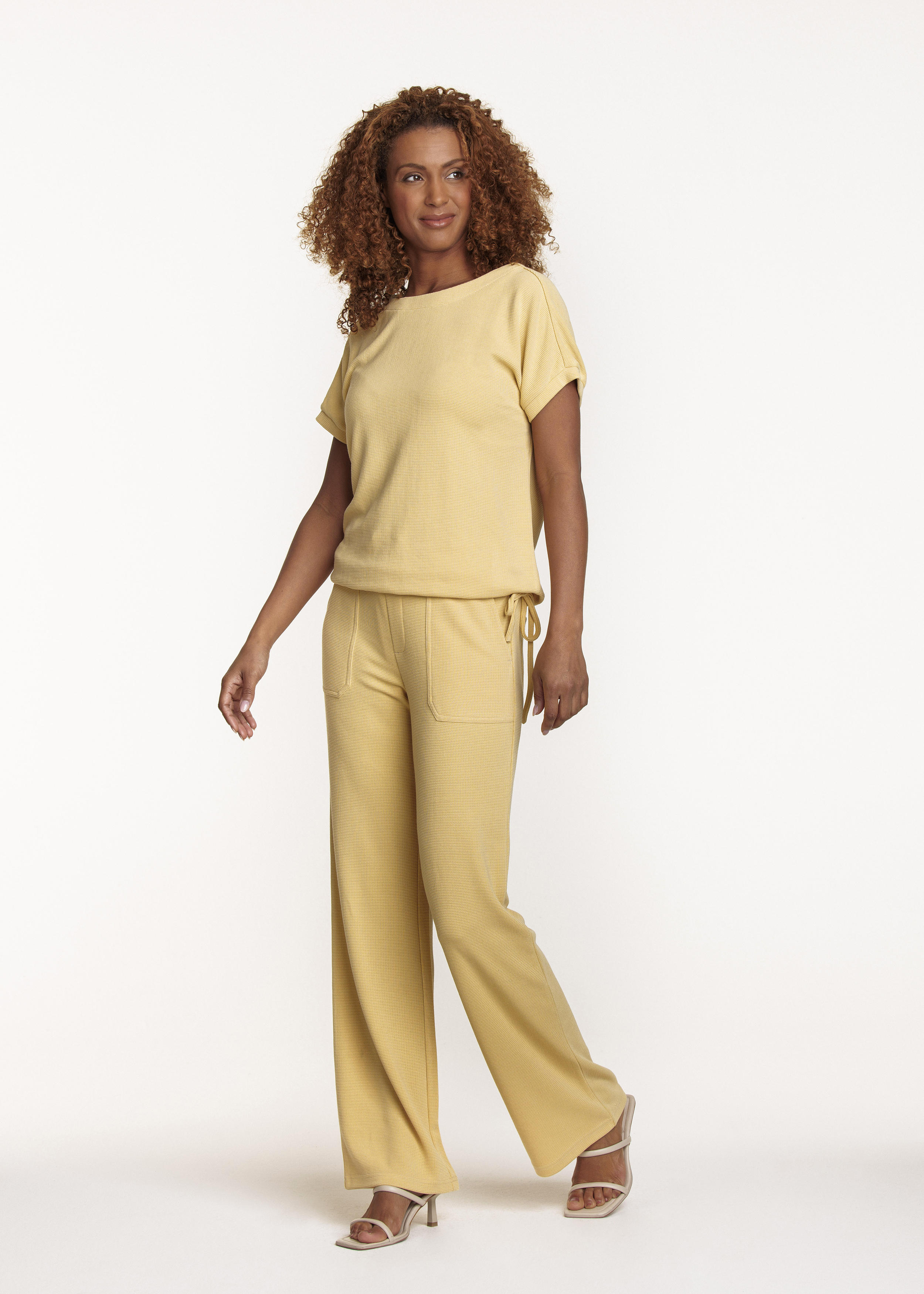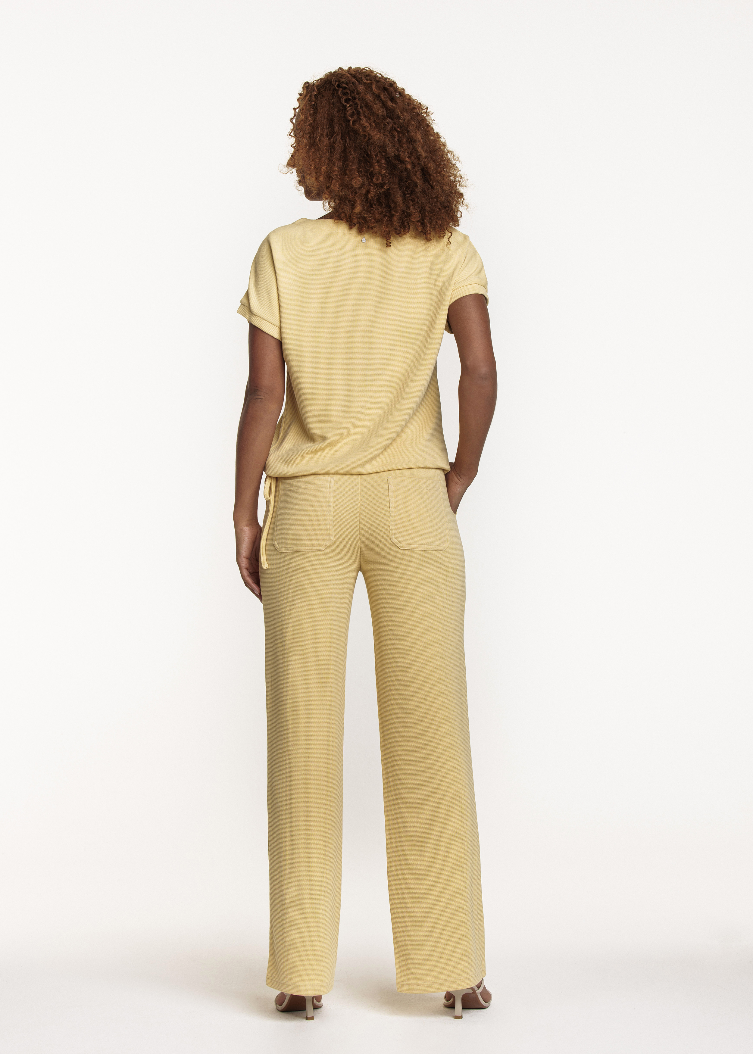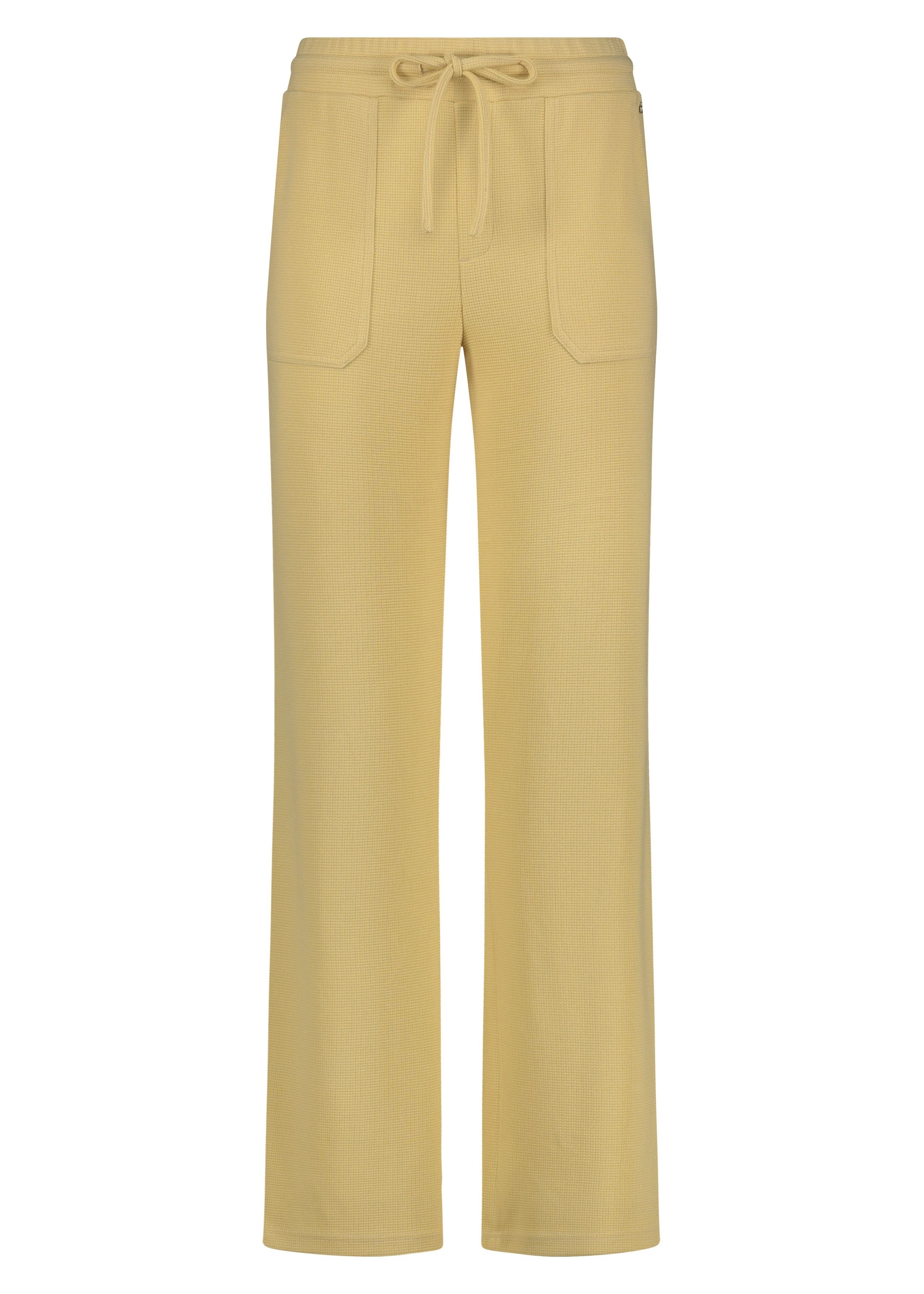 Wijde pantalon van gebreide piqué stof. Deze pantalon heeft opgestikte steekzakken aan de voorkant en opgestikte achterzakken. In de tailleband zit elastiek met een drawstring. De kwaliteit is een mix van 70% viscose met 30% polyester. Door het gebreide ruit reliëf zit er rek op de stof. Er zijn bijpassende piqué tops verkrijgbaar.