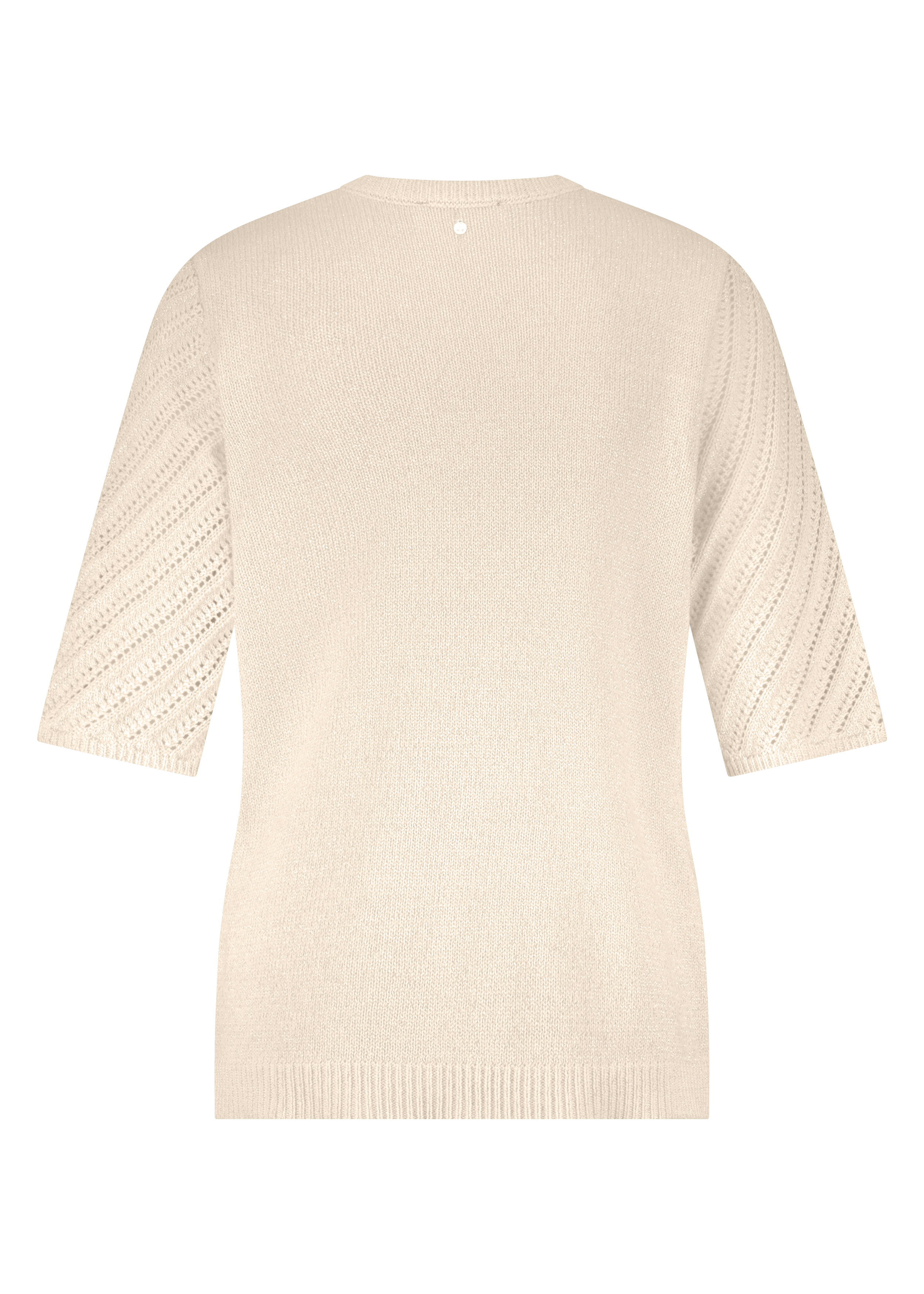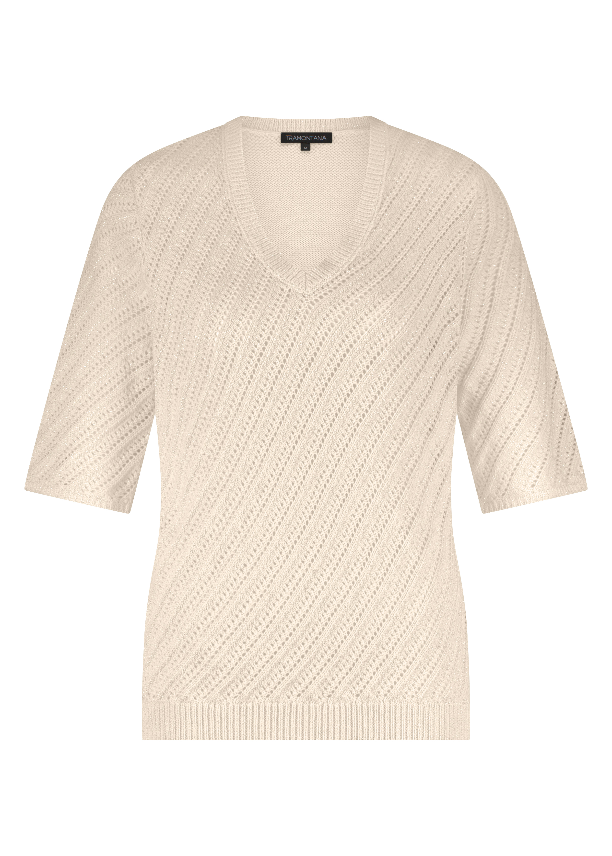 De V-hals zorgt voor een flatterend silhouet, terwijl de kleur Stone (006800) een zachte, veelzijdige basis biedt die makkelijk combineert met zowel denim als meer geklede onderstukken. De glanzende draad in het breisel geeft de trui een feestelijke touch, zonder in te leveren op draagbaarheid.